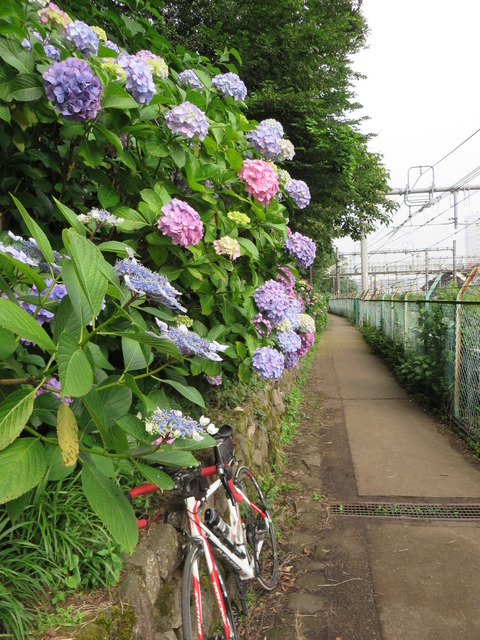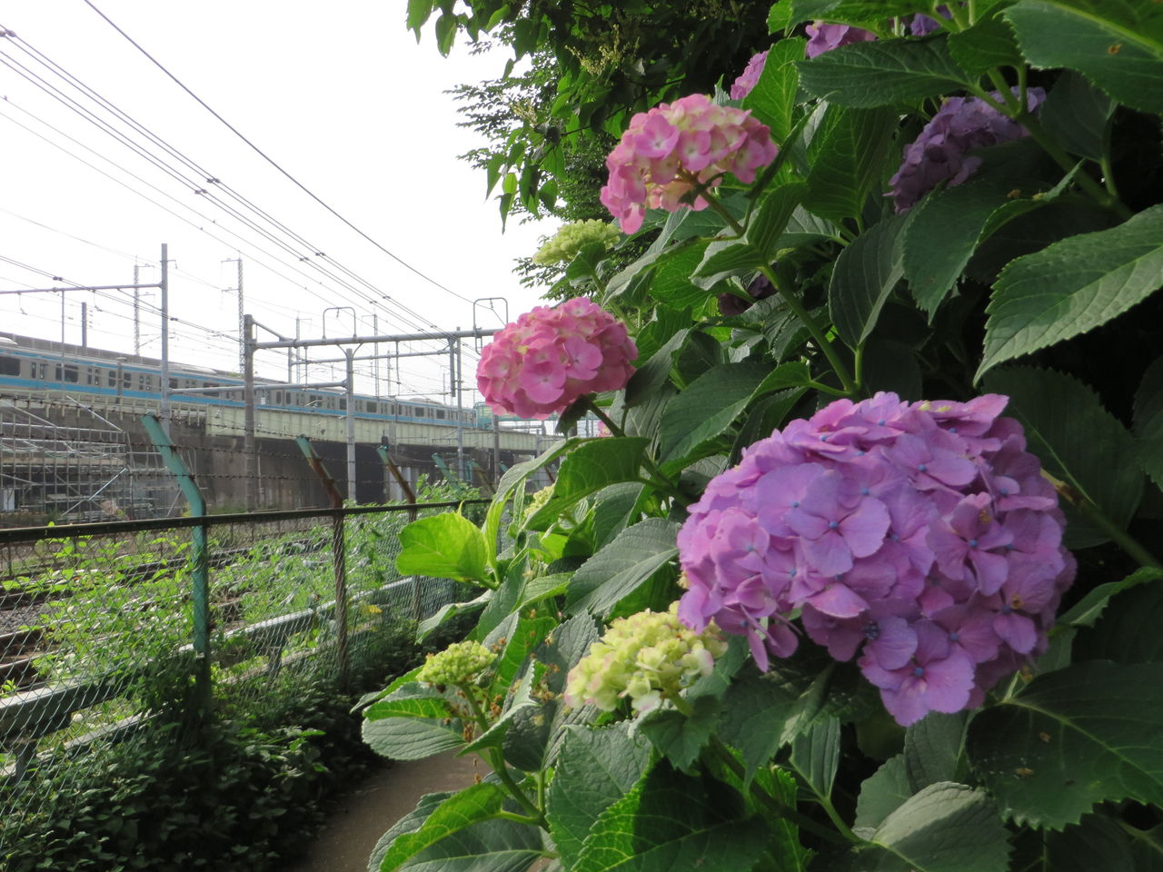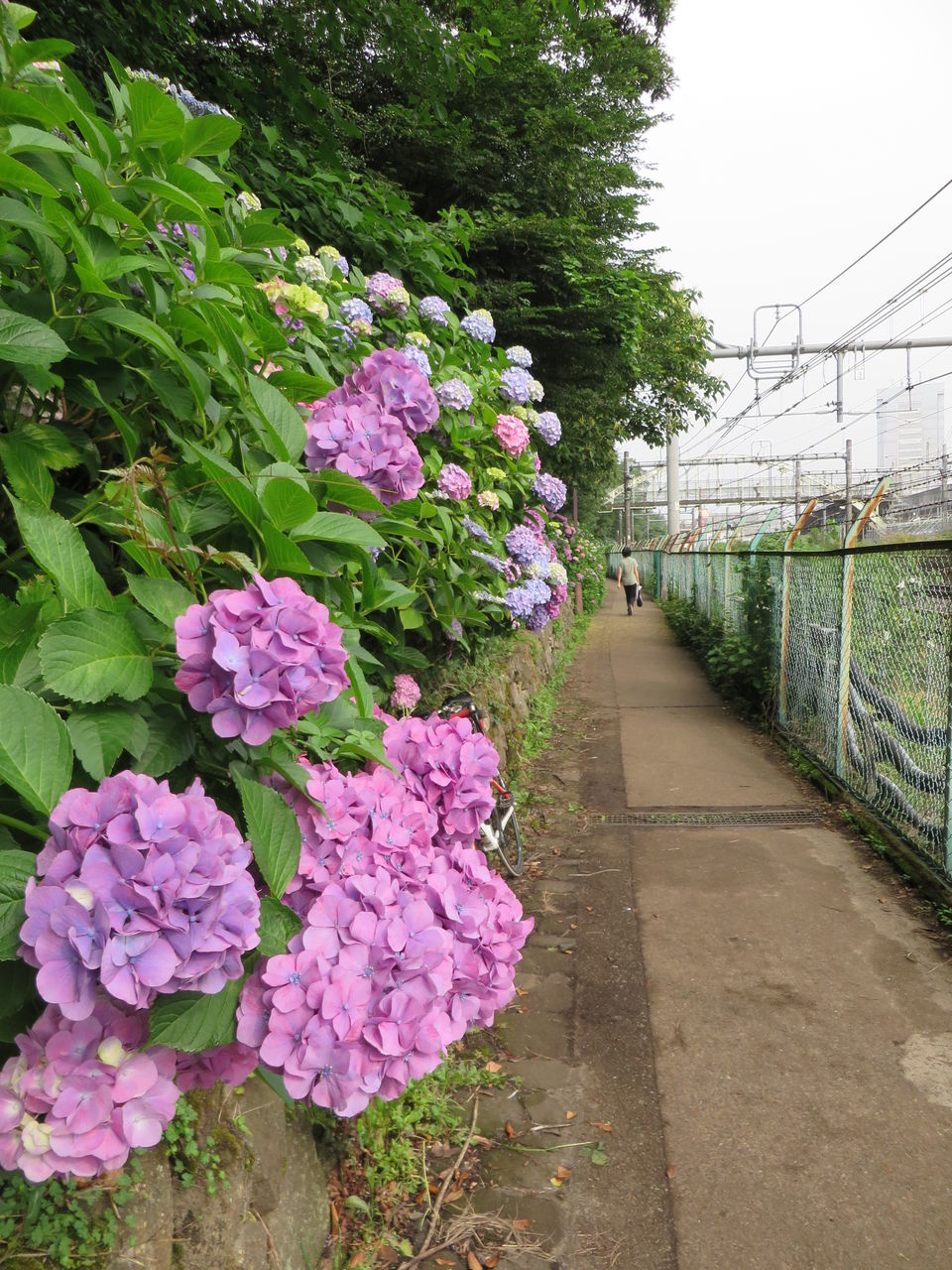 飲み屋さんが並んだ所を通り過ぎ線路と飛鳥山の麓の路地にアジサイが綺麗に咲いています