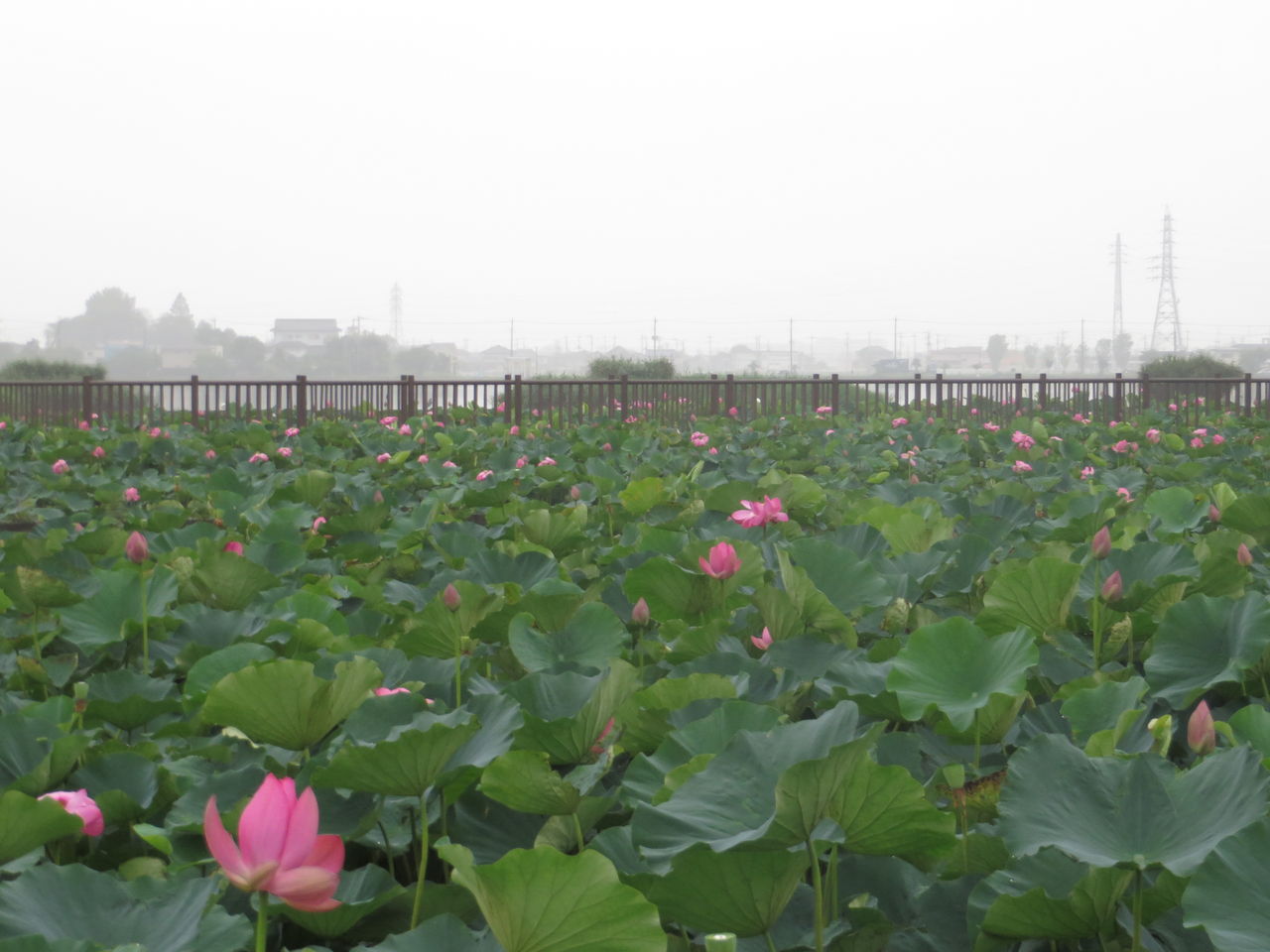途中の伊佐沼では霧の中蓮の花が咲き始めていました。