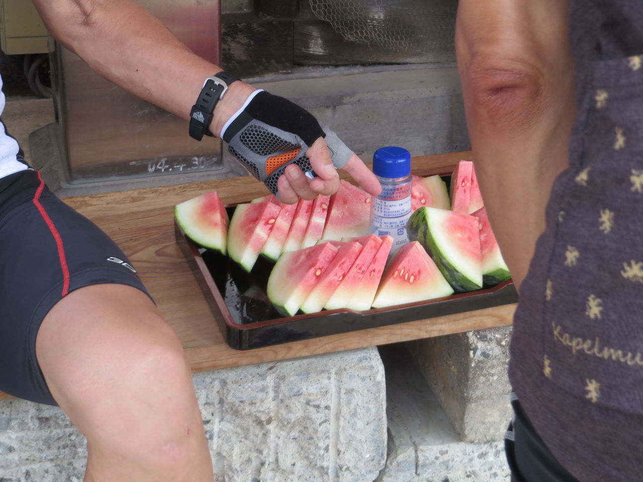 目的地で自動販売機で飲み物を買いながら皆さんと談笑しているとお店の方からスイカの差し入れ