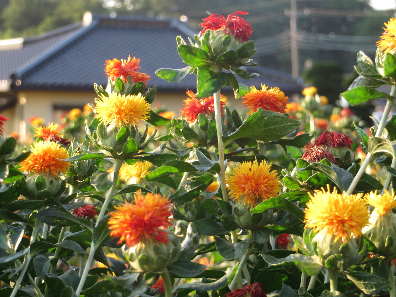 目的地のベニ花畑に到着するとノボリがいっぱい、なんと今日と、明日ベニ花祭り開催です。朝早かったのでテントとか椅子が置いてある程度でしたが昼間はきっと賑わうのでしょうね。 ノボリや案内看板が多かったのも納得です。