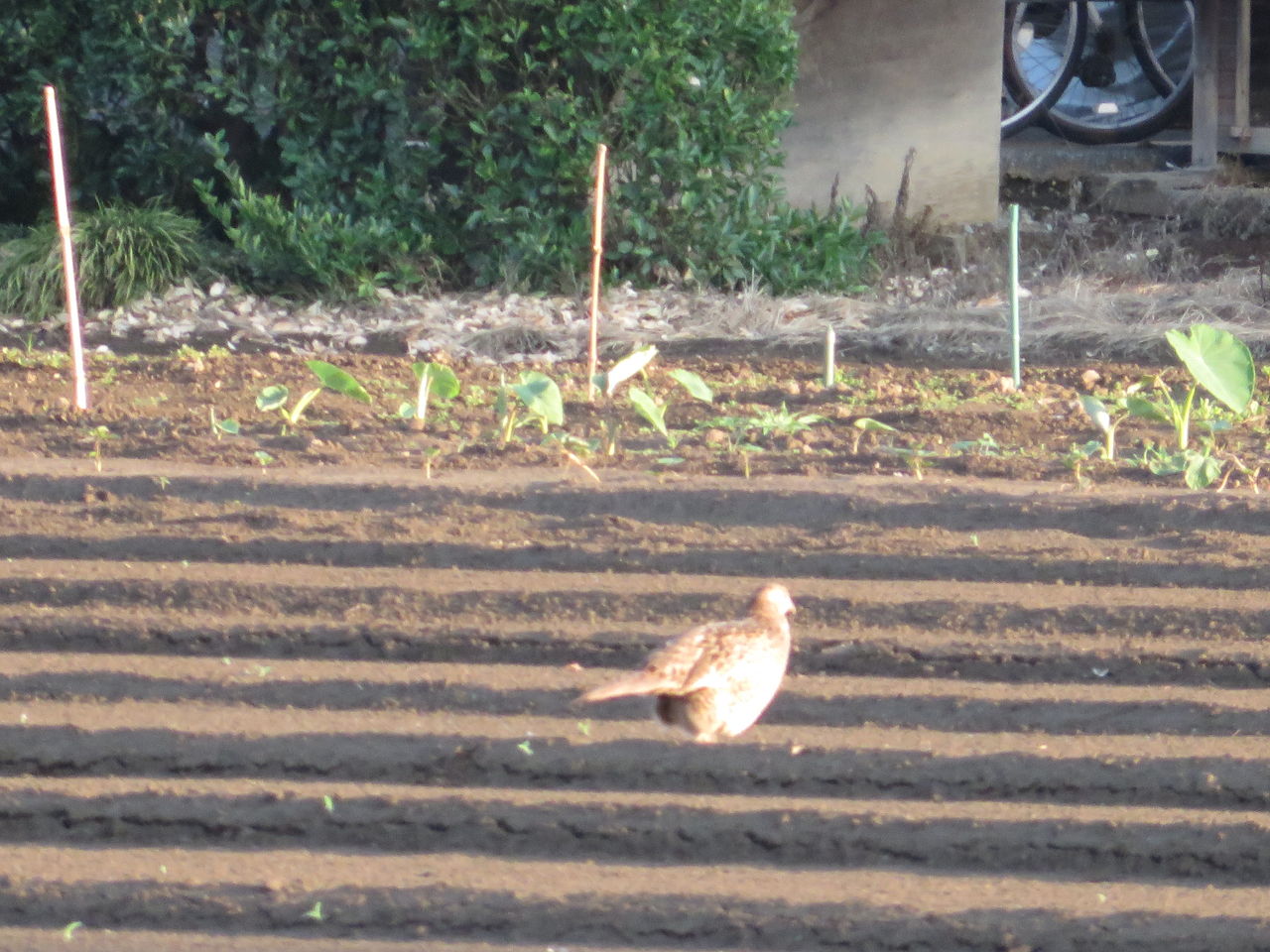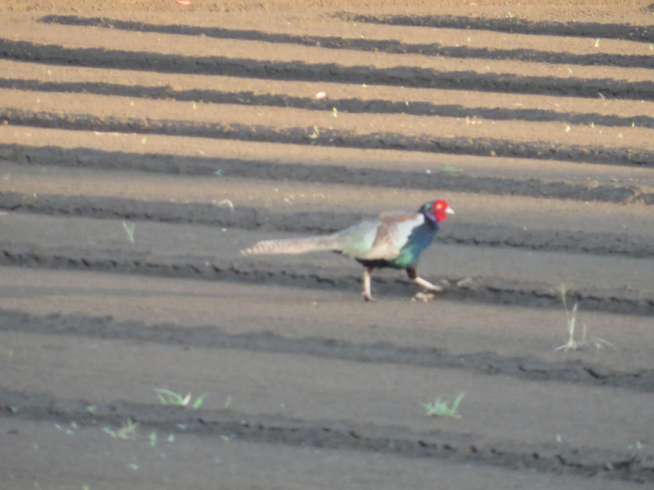目的地近くで道路をキジが横切っていきました。よく見ると畑の中は子供・メス(?)もいます、キジは以前サイクリングロード沿いで見た事があるが子供・メス(?)を見たのは初めて、自転車を止めカメラを構えますが距離が有るのでデジカメの望遠機能を目いっぱい使って何とか撮影。