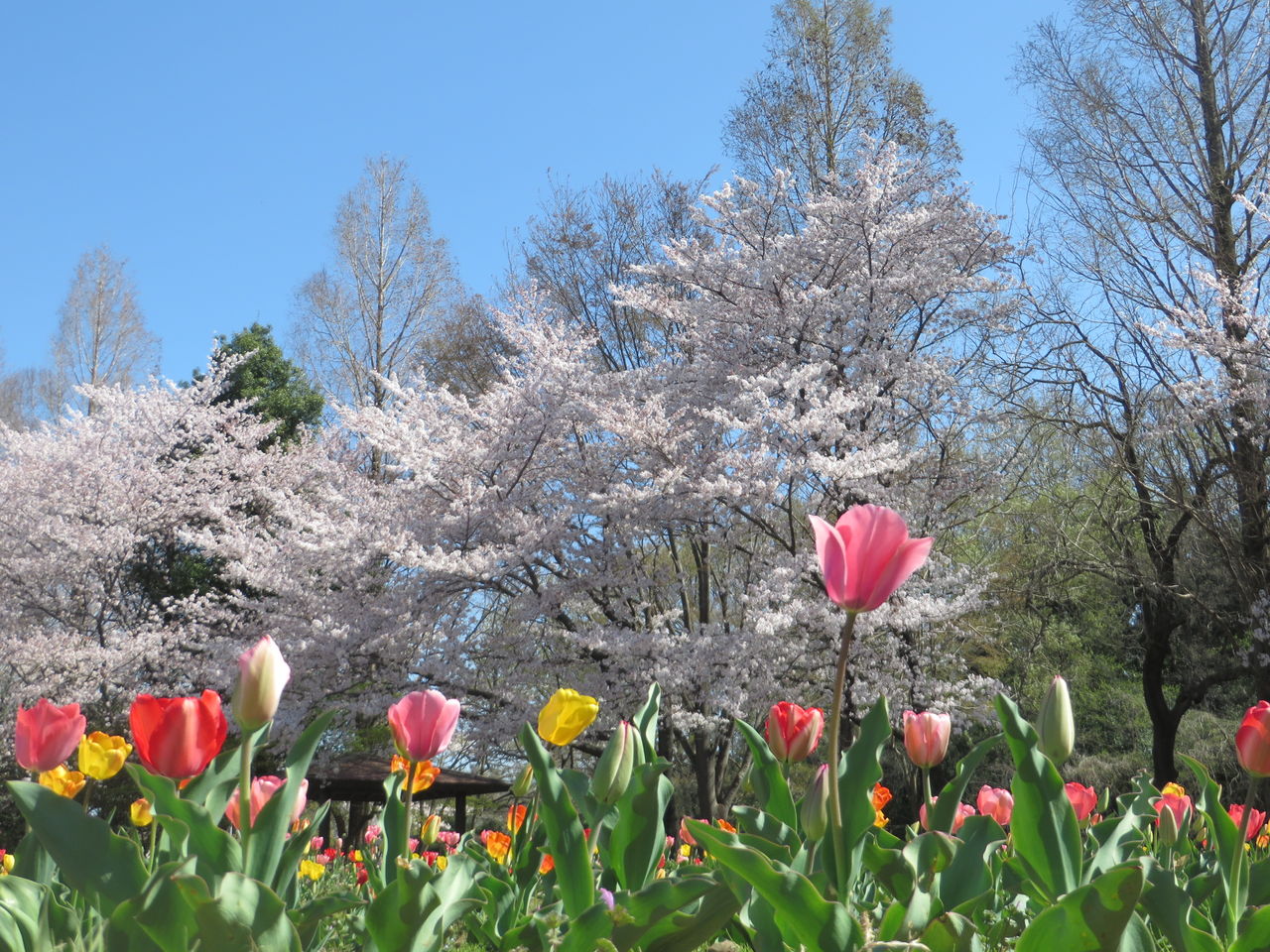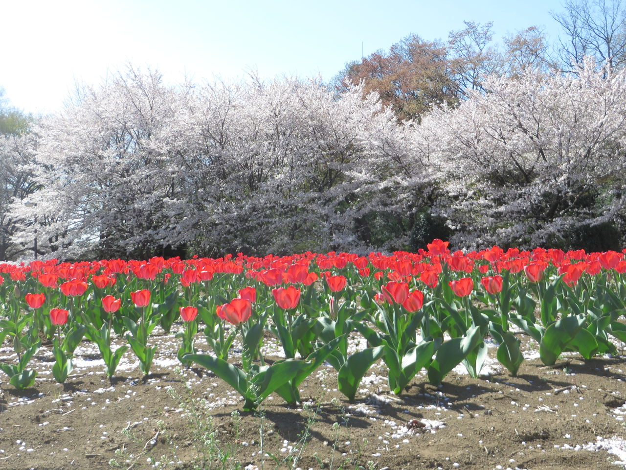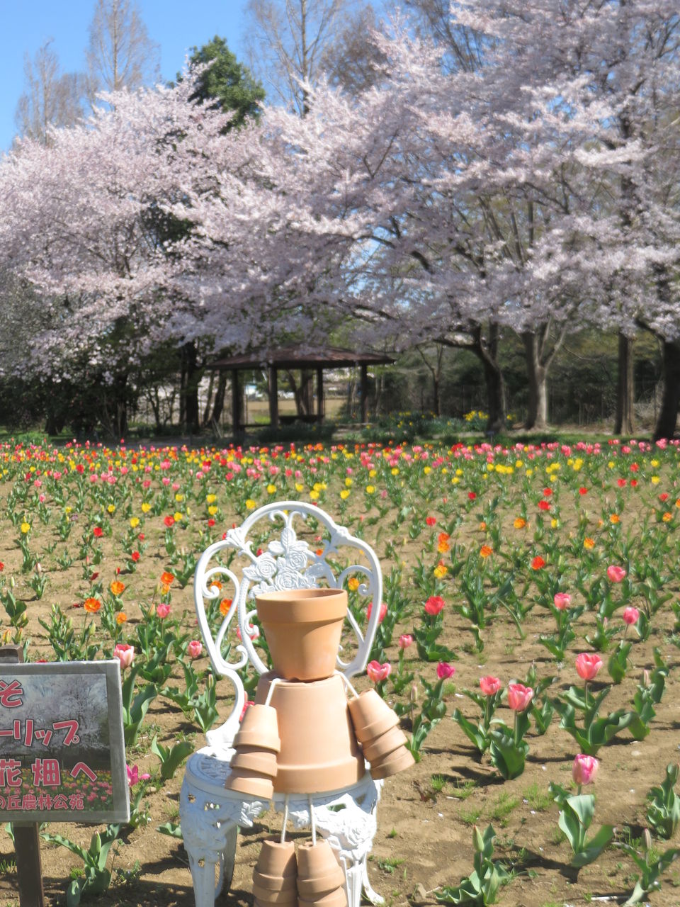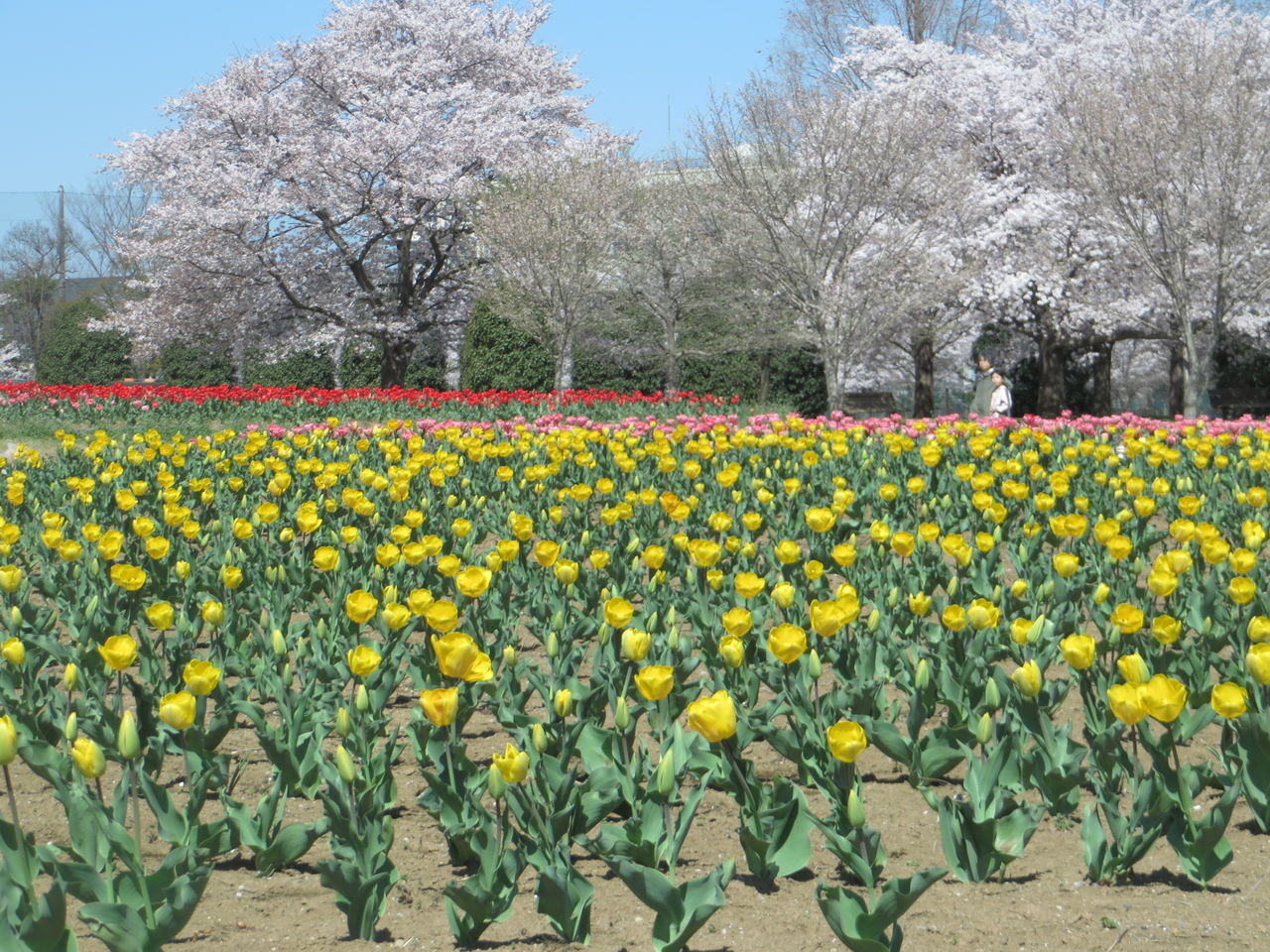 先日来た時はチューリップは殆ど咲いていなかったが今日はかなり開花、桜もまだ散っていなかったので桜とチューリップのコラボ、花の丘公園もこれから色々な花が咲いて楽しみです。