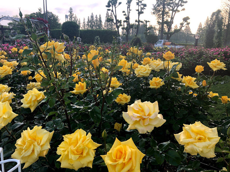 昼間は通行止めになっているバラ園の真ん中の通路からみると情報通り丁度見頃でした。園の中ではバラの消毒作業中、昼間は人が多くで出来ないのでこの時間でしか作業が出来ないそうです。このように見えない所でバラの手入れをしてくれる人がいるお蔭で綺麗なバラが見られる事に感謝です。