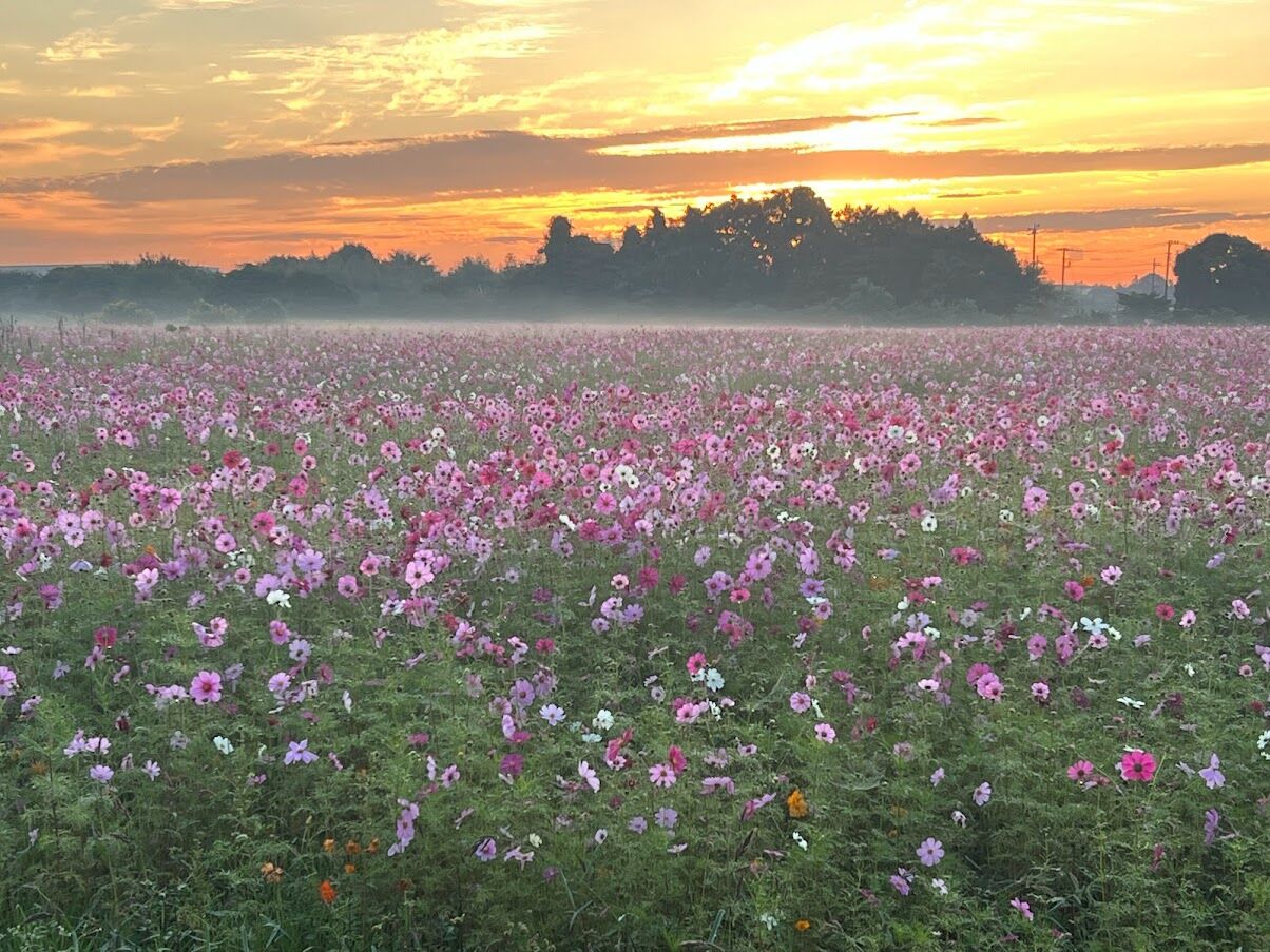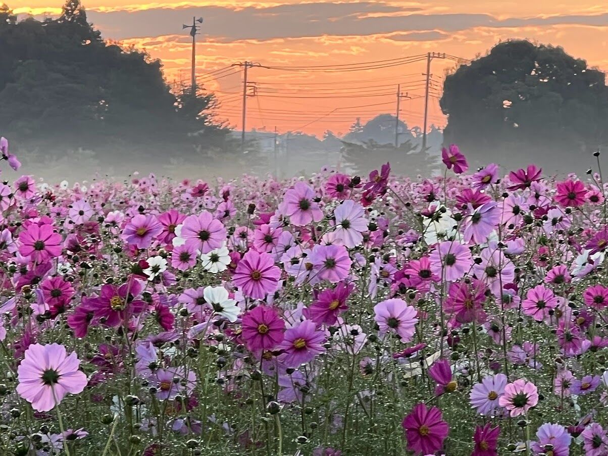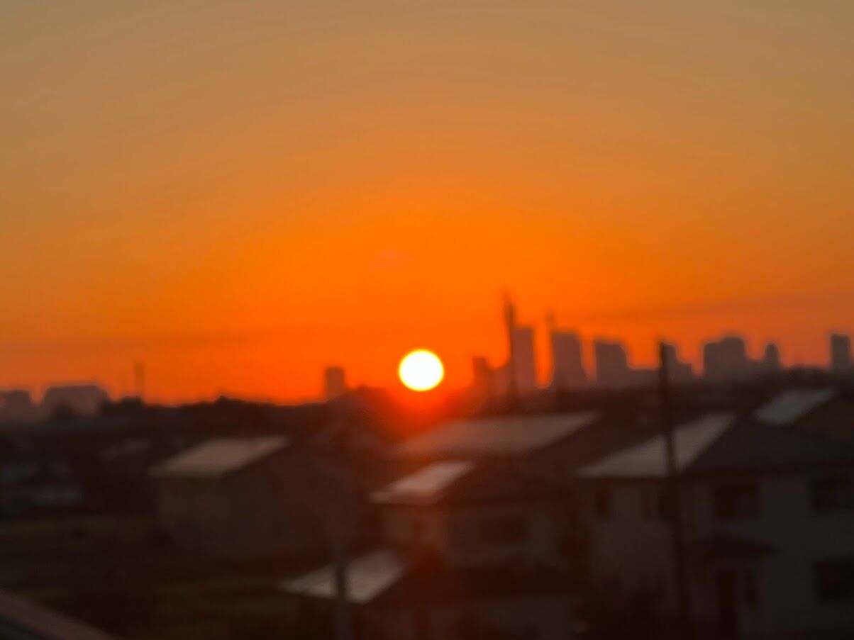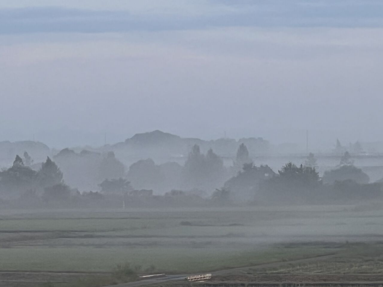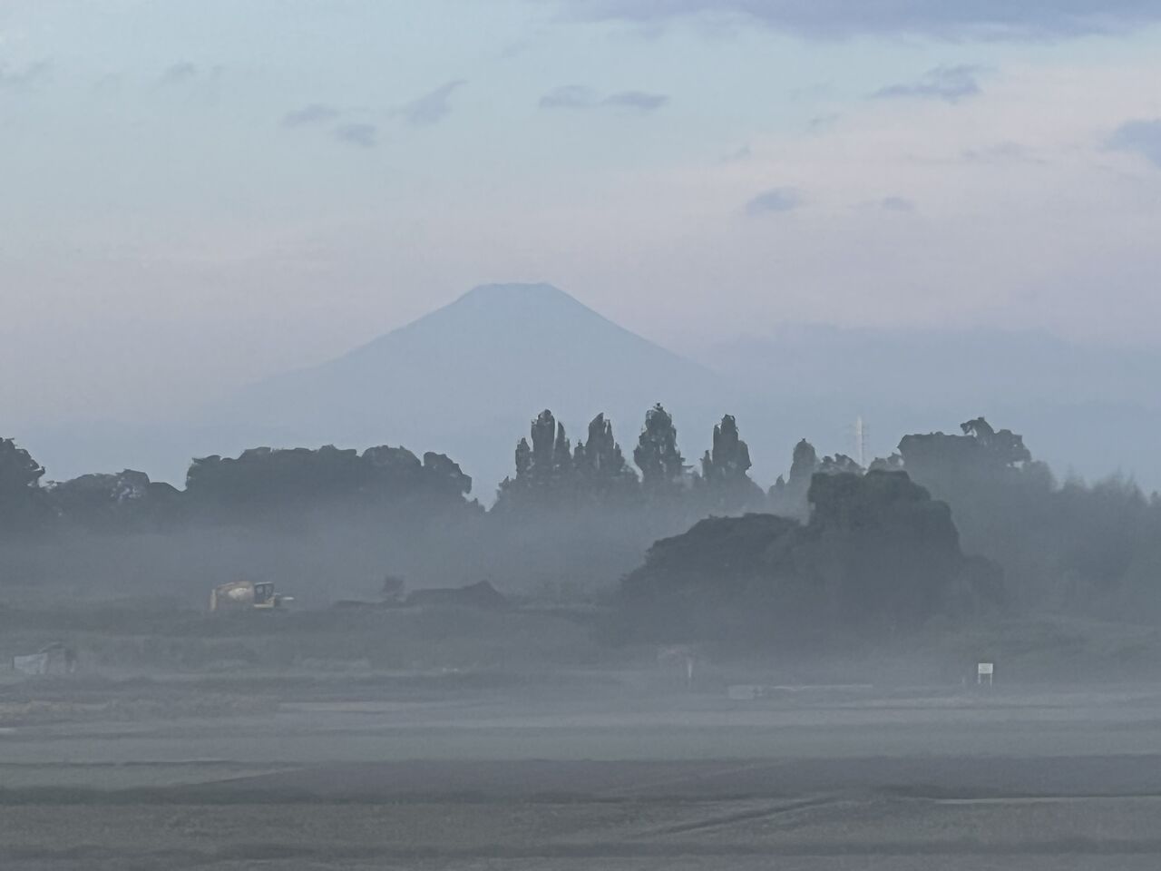 荒川左岸の土手の上から綺麗に見えました。土手の下の田んぼは朝靄でいい雰囲気です