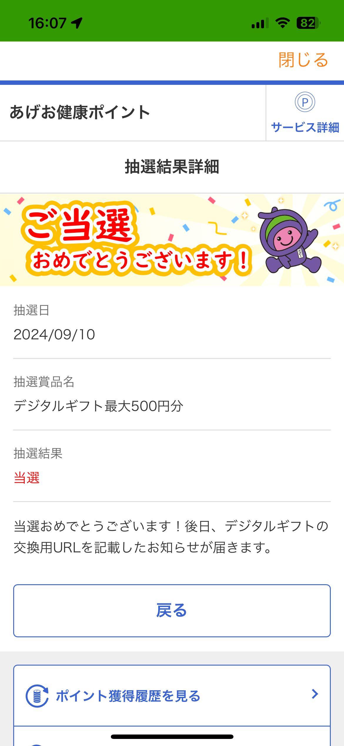 ポイントは歩いた歩数や体重測定、イベントへの参加で加算され500ポイント溜まると応募でき当選すると500円のデジタルギフトが貰える