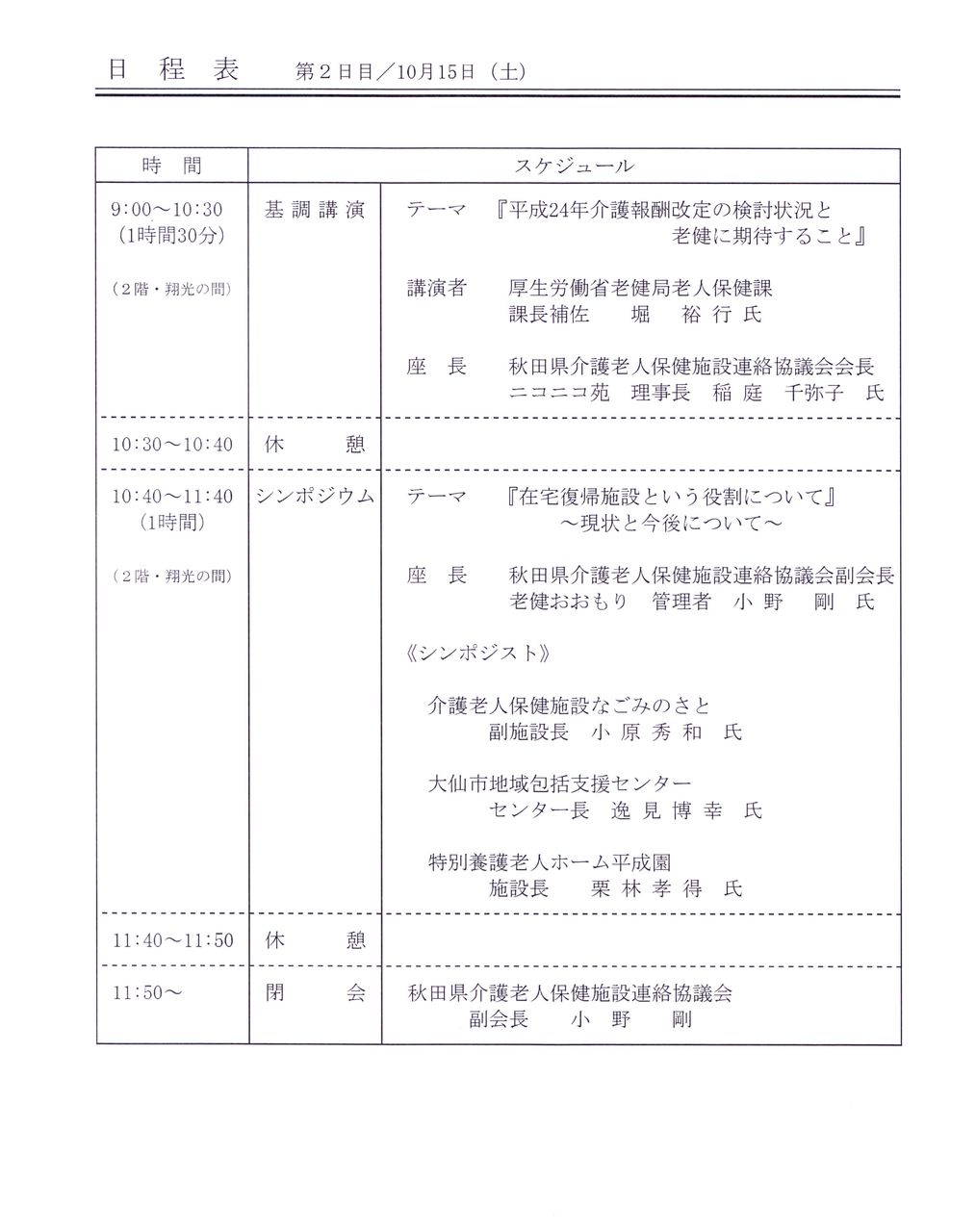 厚生労働省の方の基調講演、職員による認知症介護劇、小学校児童のボランティア体験発表、東洋大学準教授の方に進行をお願いし、医師、地域包括、看護師の方々によるパネルディスカッションなどがあります。
