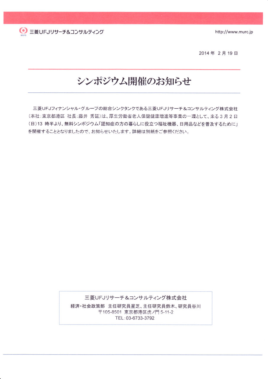 認知症の方の暮らしに役立つ福祉機器、日用品などを普及するためにという無料シンポジウムのご案内です。