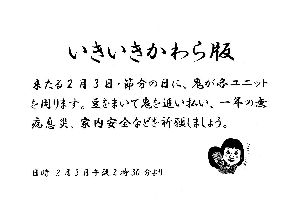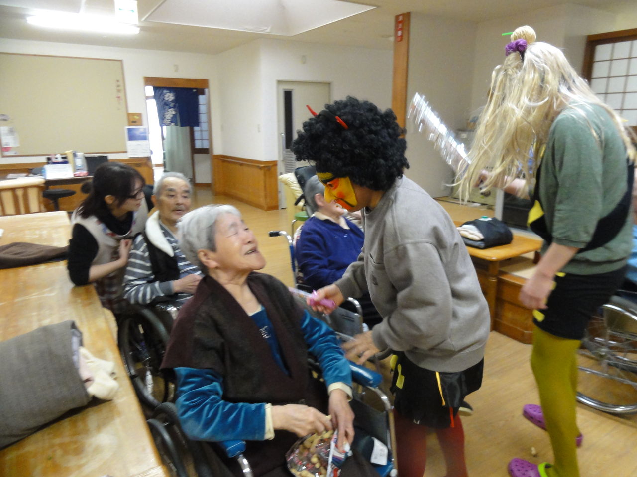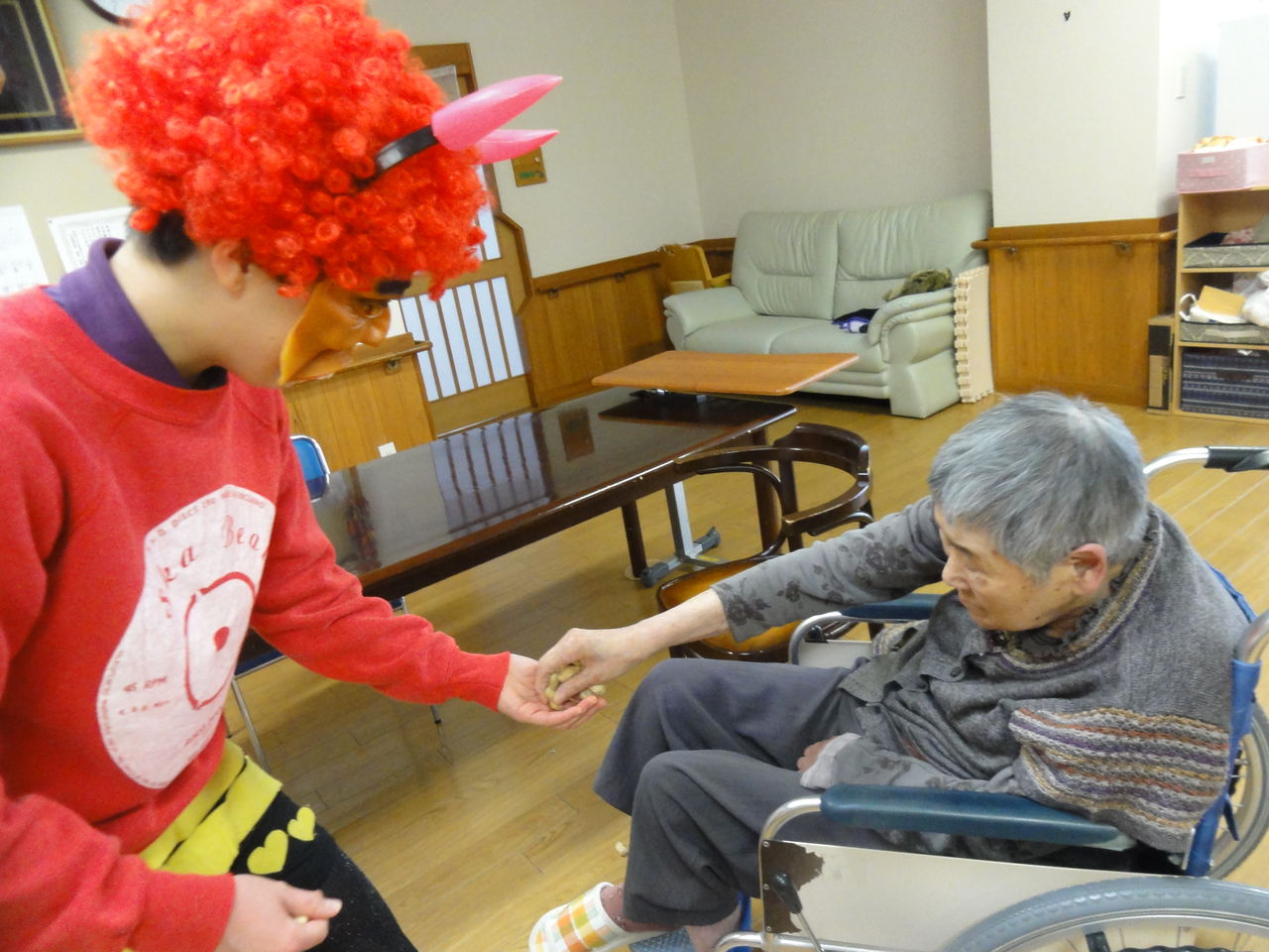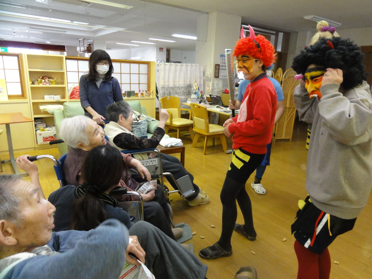 マメよぅ〜マメマメ 2015年02月03日 DSC06594 ふくろうさんからのメッセージ・・・よくみると20150203164040-0001 そして今日は、2月3日節分さぁ、鬼はそとっ!福はうちぃぃぃぃぃ! 豆まきのスタートです。 DSC06712 DSC06663 ほれほれ豆をまいて鬼を追い払えーーー DSC06622 DSC06752 鬼の迫力にびっくり あれ どーしたんでしょ?鬼に豆をおすそわけ DSC06660 みなさんなんて優しい 最後はみんなであまーくおいしい甘納豆で茶話会! ご利用者の方から頂いたぁ?まめをおいしくいただいた鬼さんたちでした・・・・・