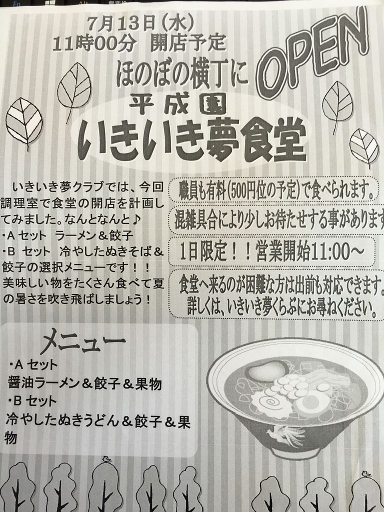 平成園 いきいき夢食堂 2016年07月13日 本日限定、いきいき夢食堂がオープンいたします ラーメン、そばともに、セットメニューになっております。 混雑が予想されますので、早めにお越しください image image image image