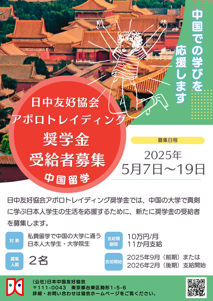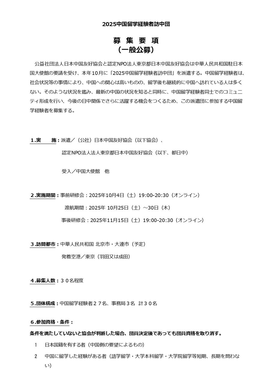 公益社団法人日本中国友好協会と認定NPO法人東京都日本中国友好協会が中華人民共和国駐日本国大使館からの要請を受け、 10 月に「2025中国留学経験者訪中団」を派遣することになりました。