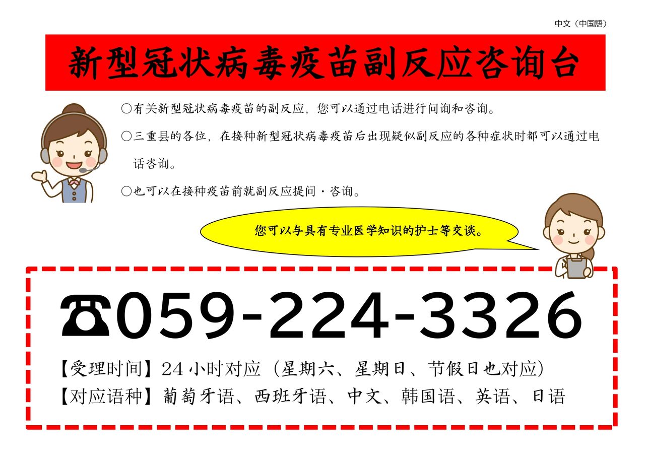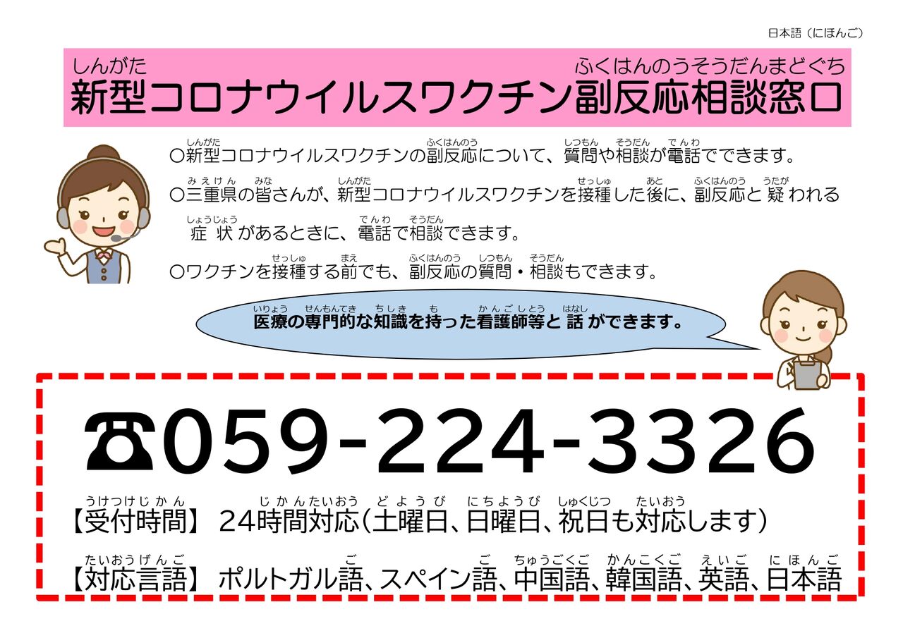 多言語による新型コロナウイルスワクチン副反応相談窓口の情報なども掲載されています。