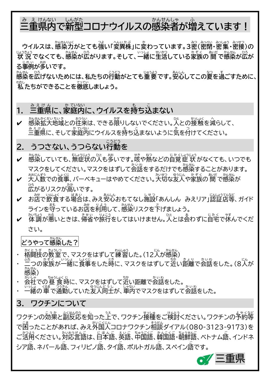 新型コロナウイルス感染症について三重県では感染状況や行政の支援、医療など様々な情報が伝えられていますが、その多くは日本語です。県内で暮らす外国人のうち日本語が十分に理解できない人たちの間では情報格差による不安が広がっています。