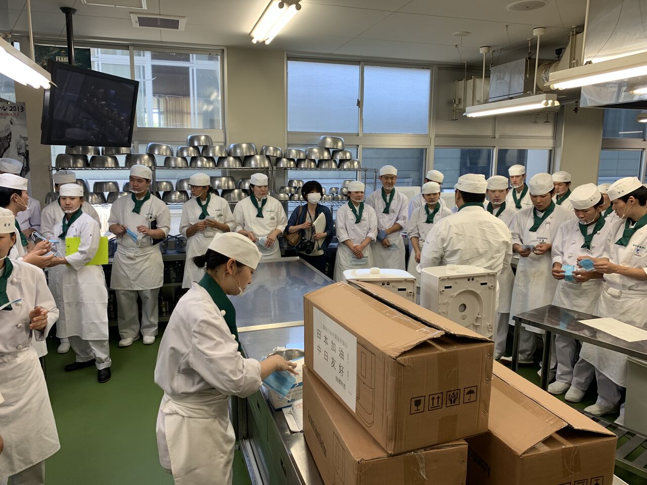 同部の北村部長は「調理をしている身としてコロナ対策の物を頂けるのはありがたい。これからもっと認めていただけるよう精進したい」とお礼を述べ、舟橋会長は「中国から頂いた物が『まごの店』(「高校生レストラン」としてドラマのモデルになった同校の調理研修施設)や高校教育に役立ててもらえるのは嬉しい」と話しました。
