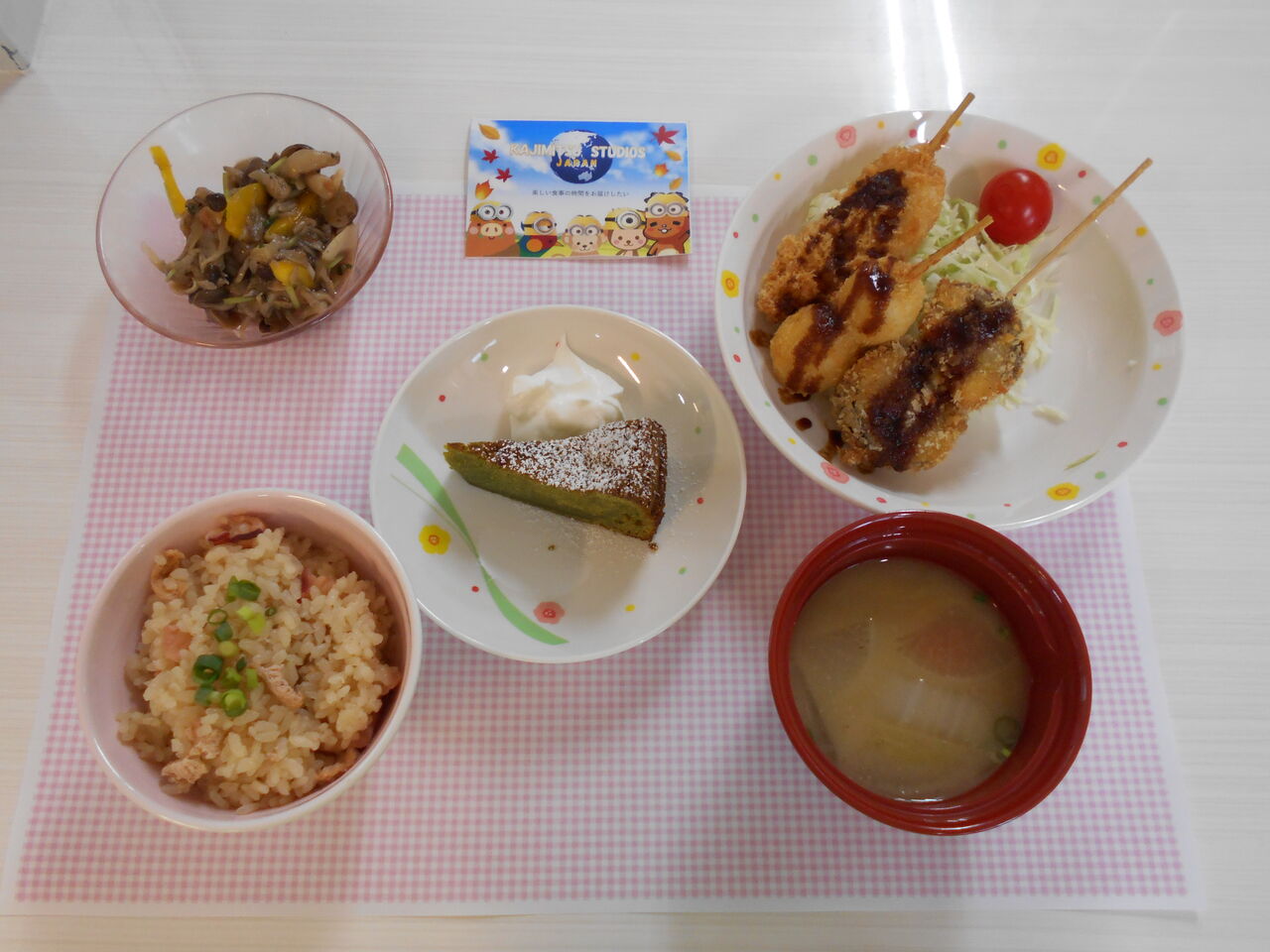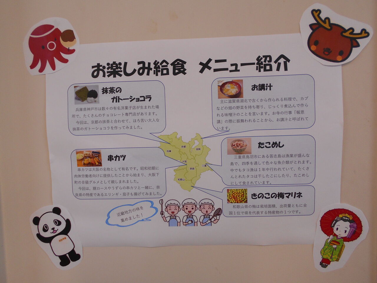 メニューは、たこめし(三重)・串カツ(大阪・奈良)・きのこの梅マリネ(和歌山)・お講汁(滋賀)・抹茶のガトーショコラ(兵庫・京都)でした