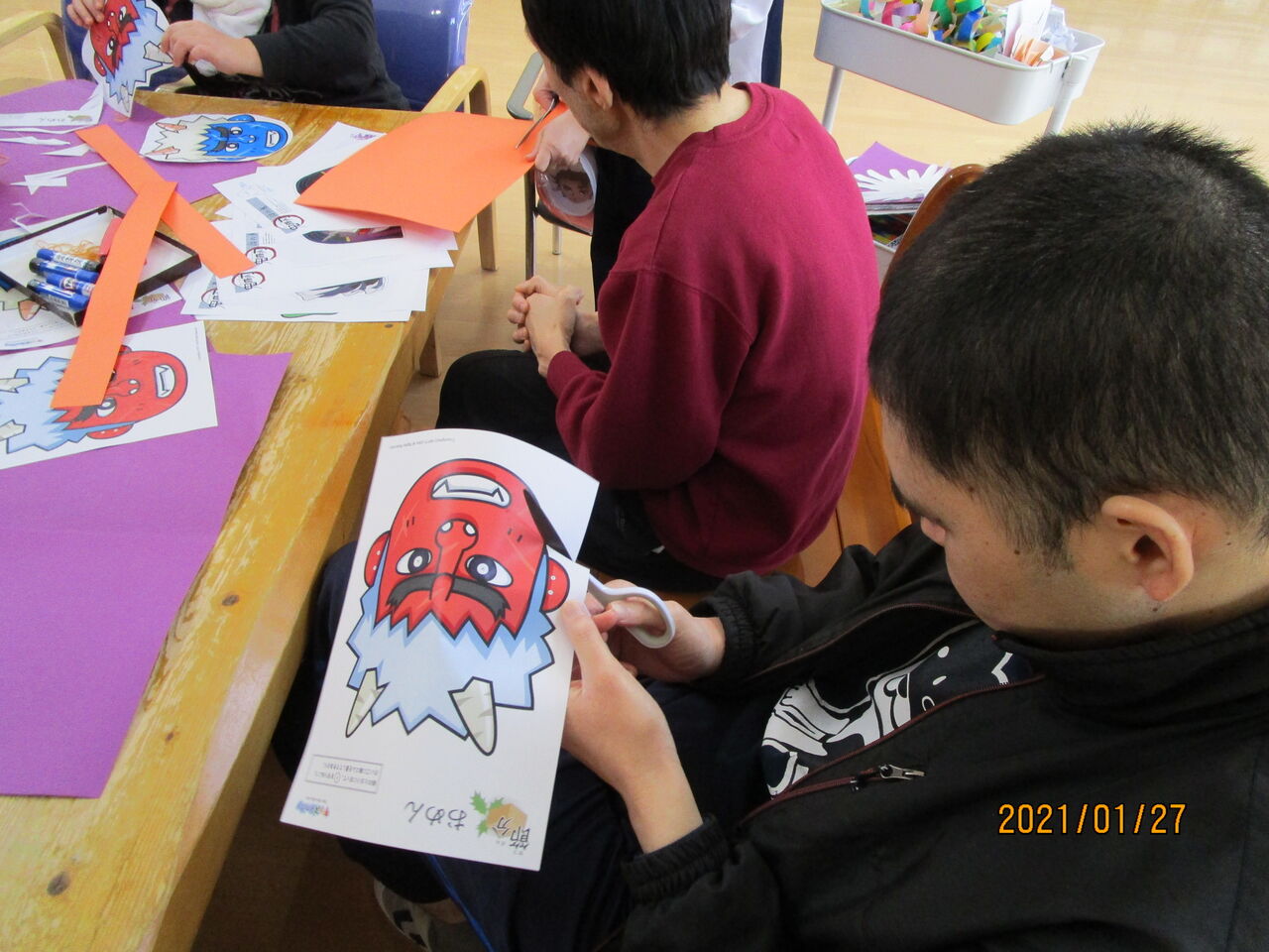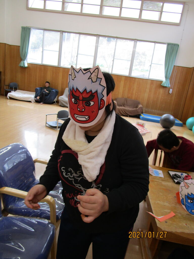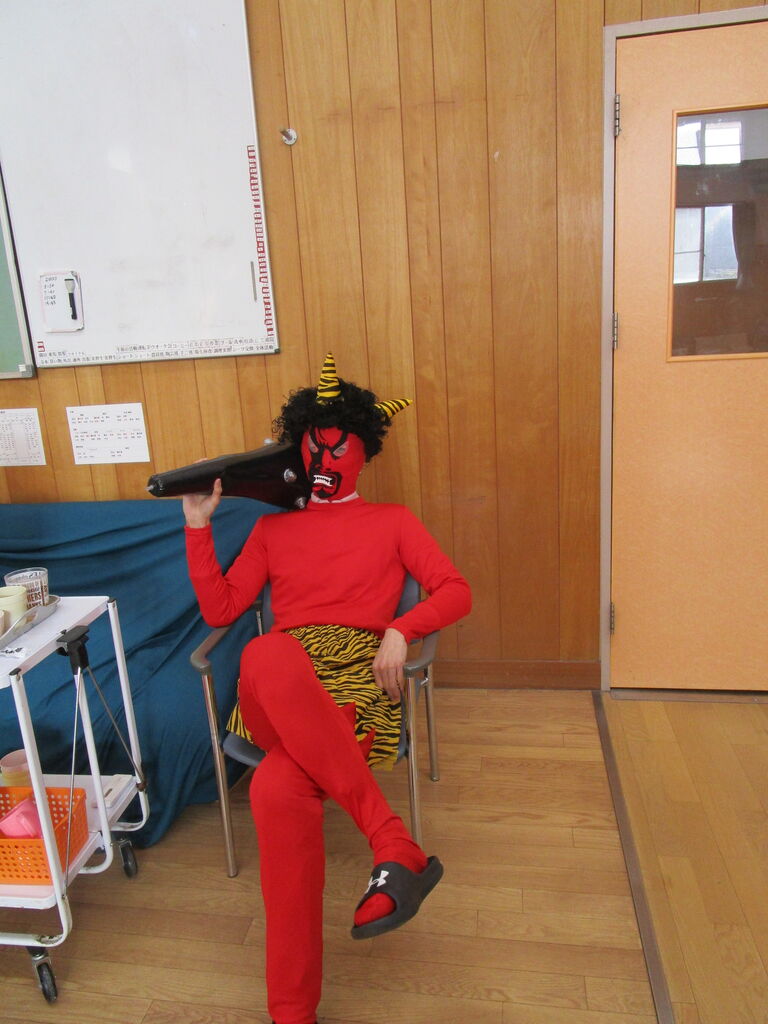 お昼ご飯は恵方巻と鬼ロールケーキが振る舞われ、皆さん喜んで食べていました