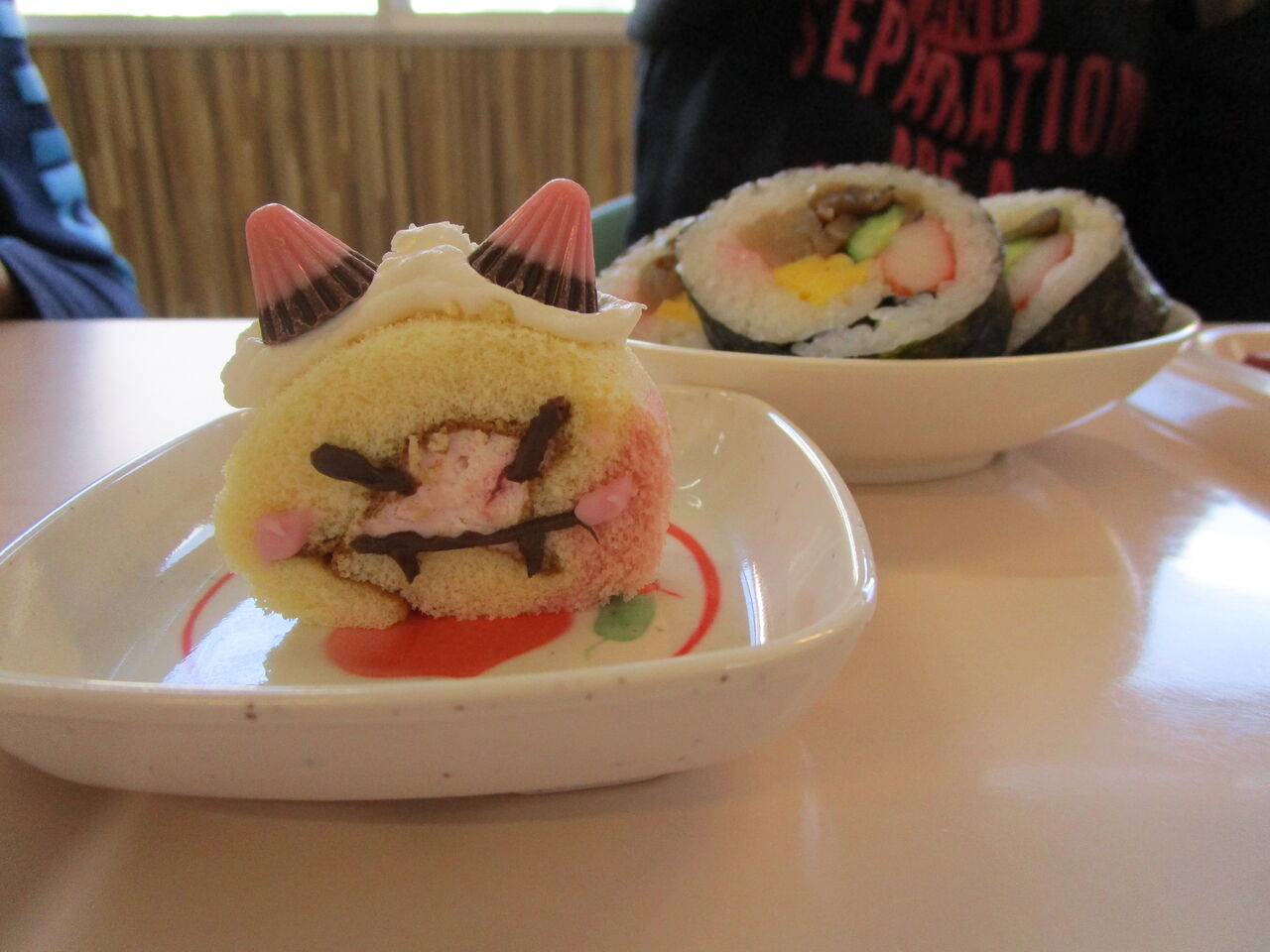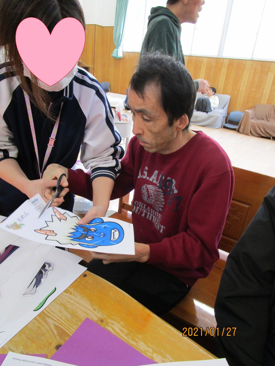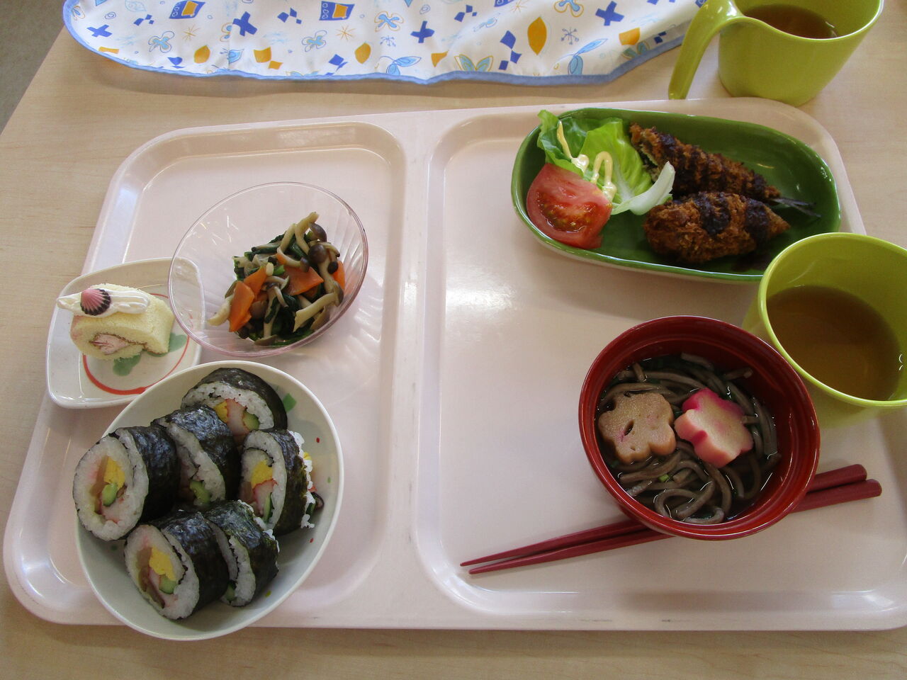 お昼ご飯は恵方巻と鬼ロールケーキが振る舞われ、皆さん喜んで食べていました