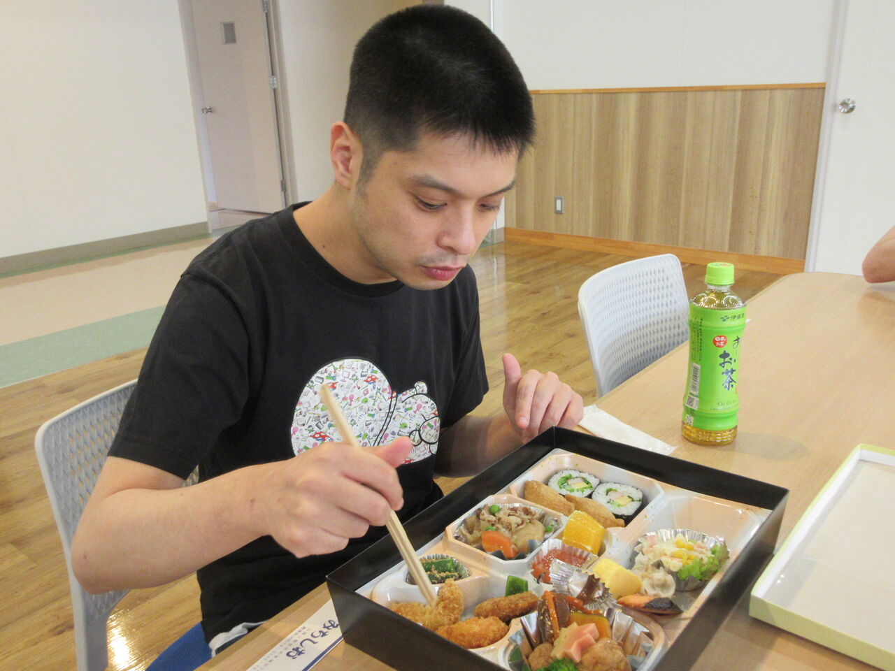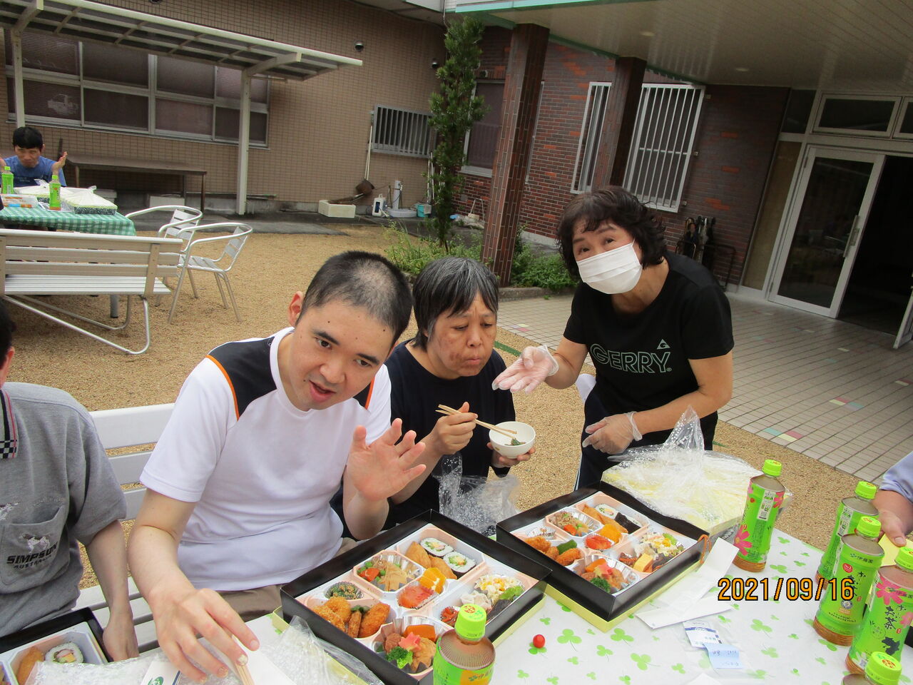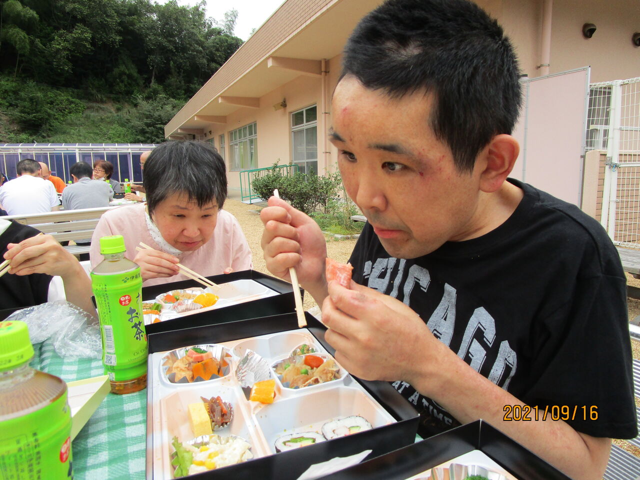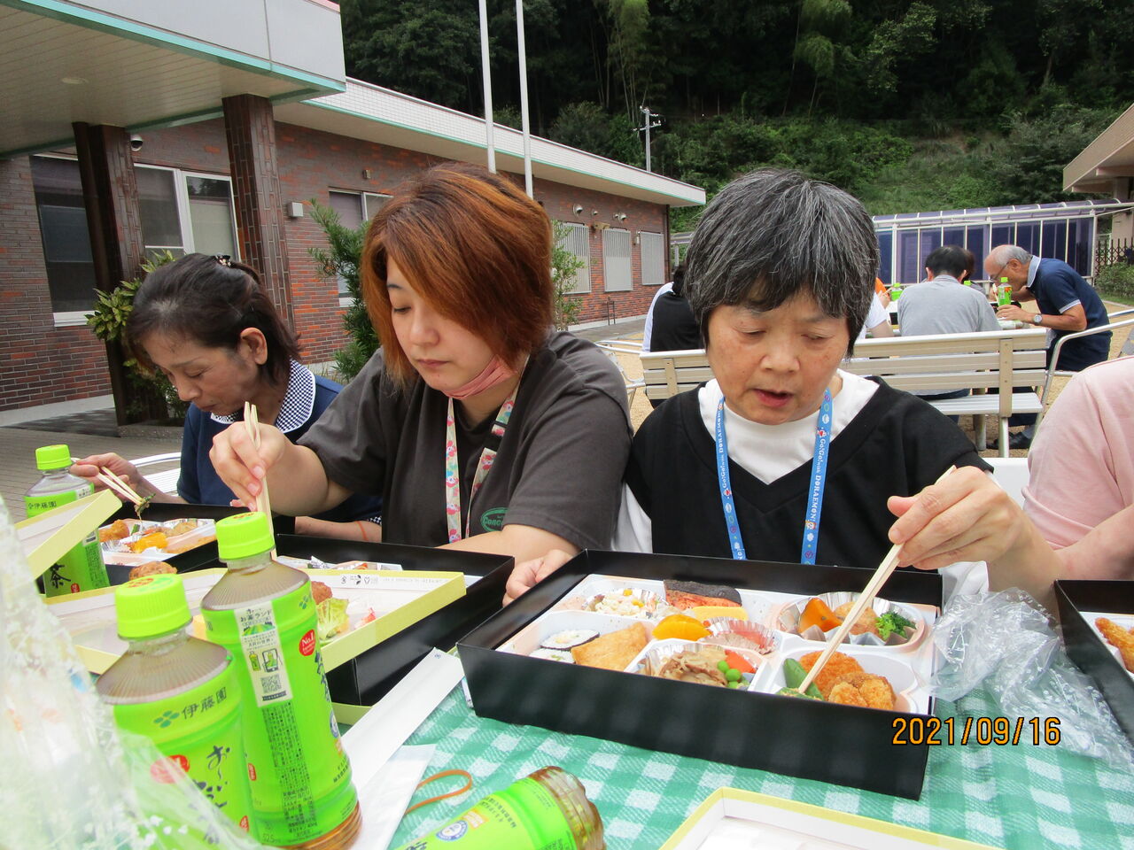 昼食は、外出先で食べる予定だった豪華なお弁当を、グループに分かれ園内の好きな場所で食べました