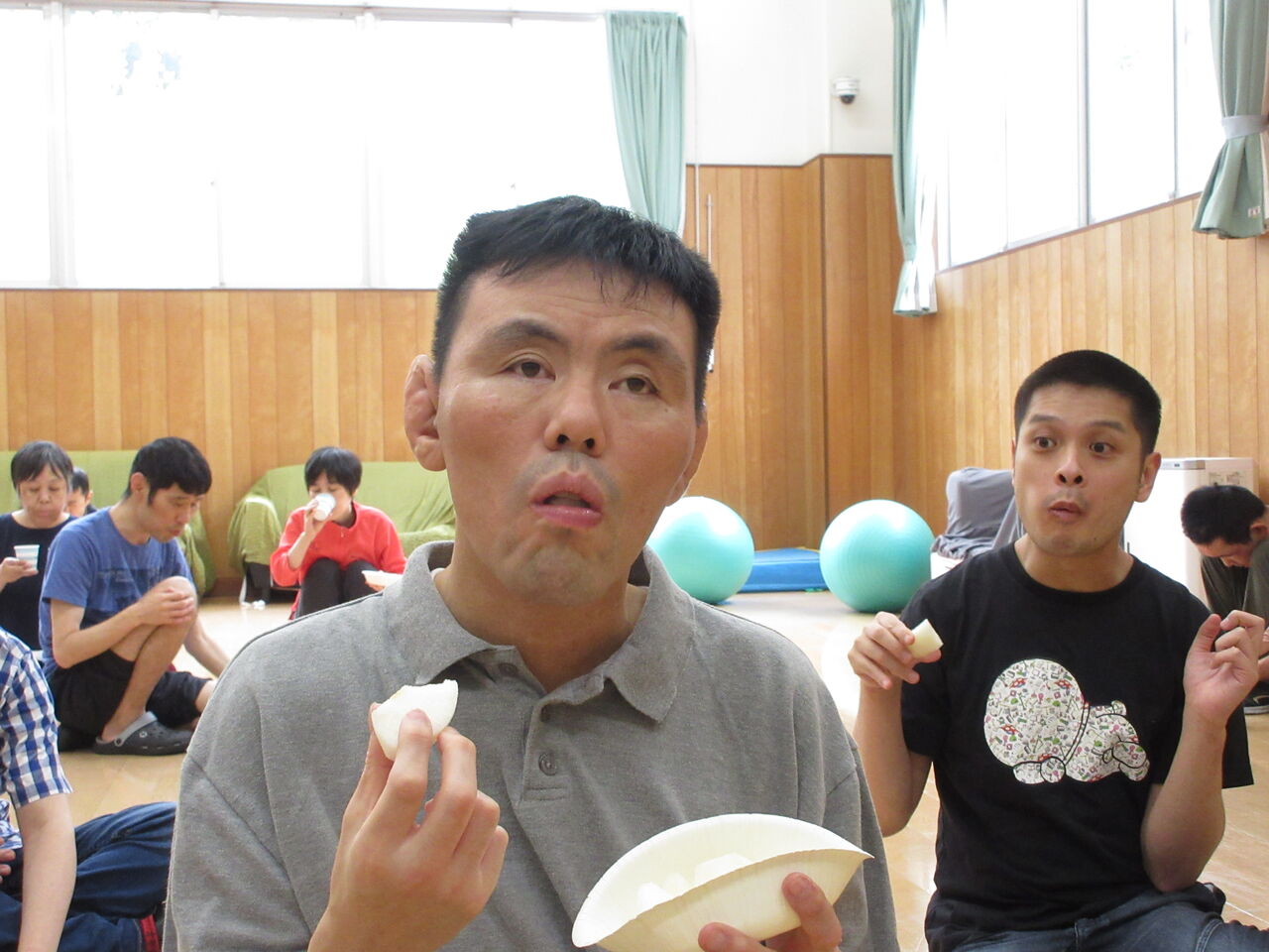 利用者と職員全員がゲームに挑戦し、みんな上手に梨を取っていました