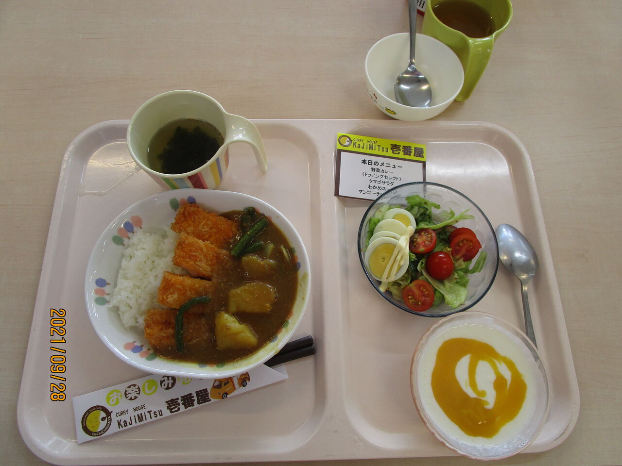 固定メニューの たまごサラダ🥗・わかめスープ・マンゴーラッシープリン🍮と合わせて、美味しそうなオリジナルカレー定食が出来ました