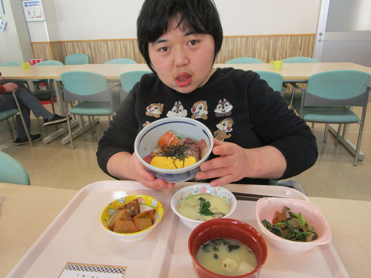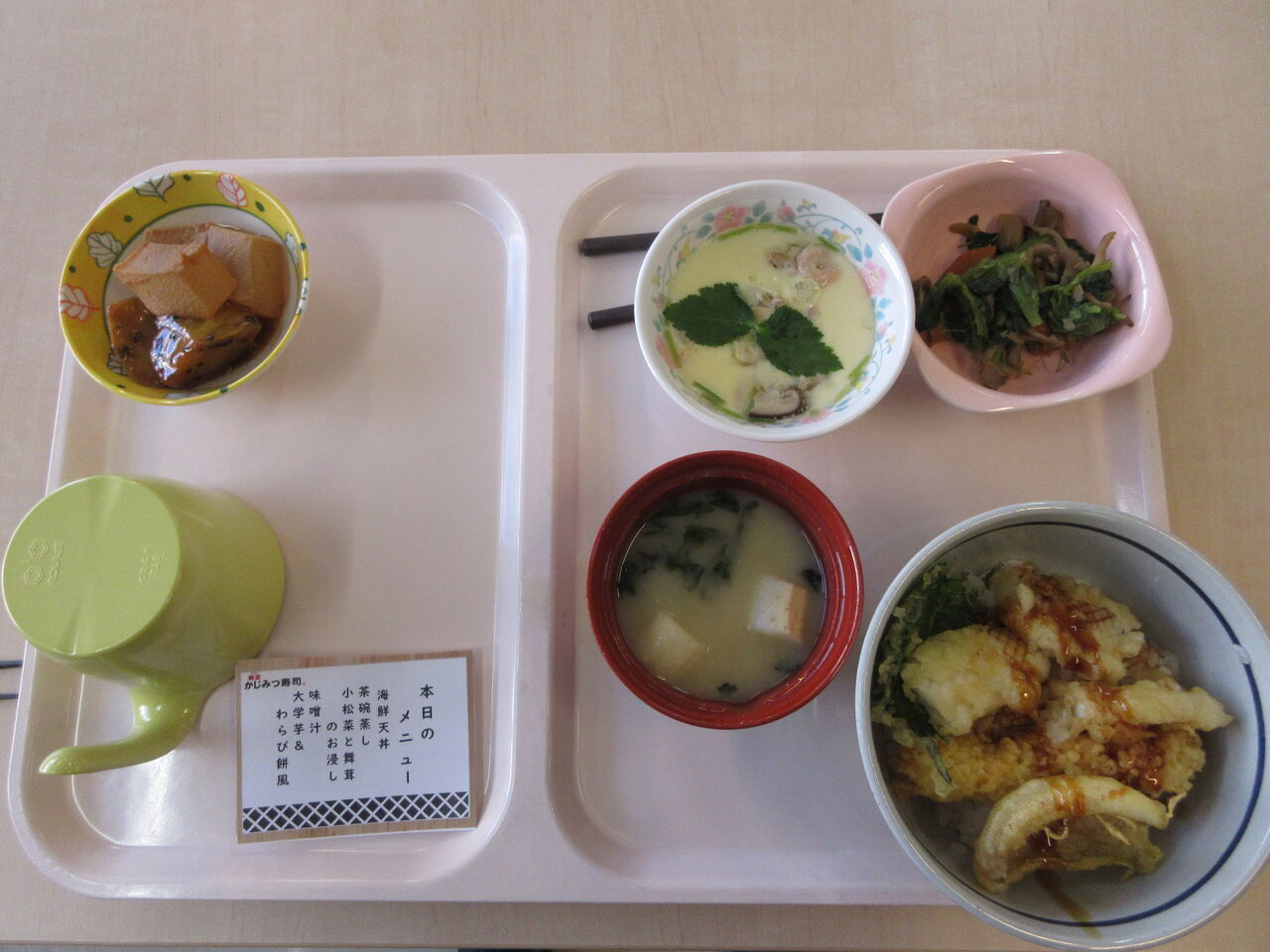 今回のセレクトメニューは、海鮮天丼・海鮮丼・にぎり寿司の3種類からメインを1つ選んでもらい、固定メニューの茶碗蒸し・小松菜と舞茸のお浸し・味噌汁・大学芋&わらび餅風デザートと合わせて、美味しそうなオリジナルランチが出来ました