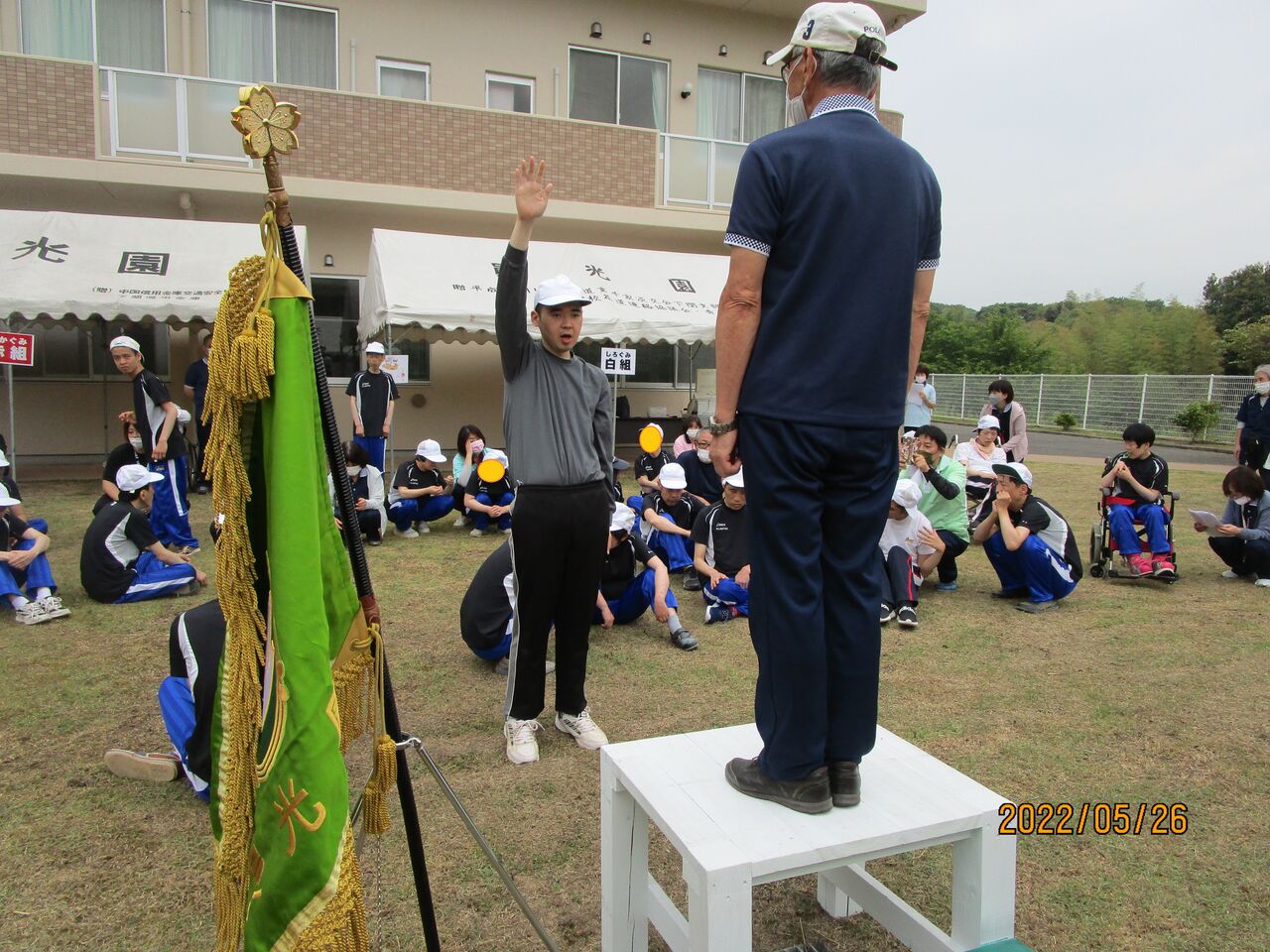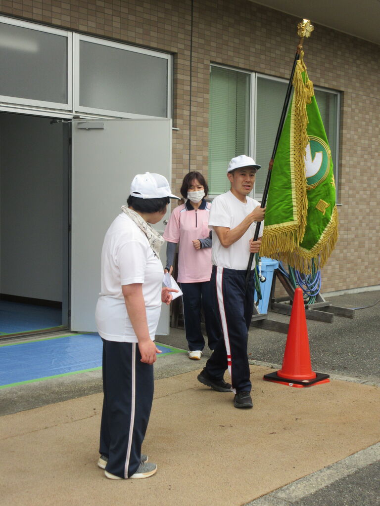 まず開会式では園旗リレーをし、園長の所まで園旗を繋ぎその後、利用者代表の方に選手宣誓をしてもらいました