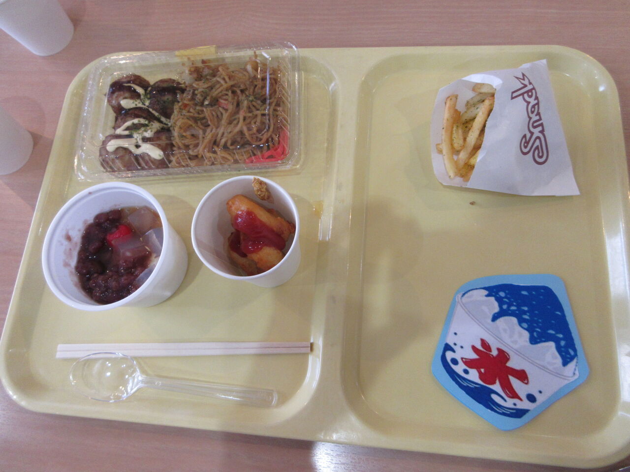 メニューは、焼きそば・たこ焼き・フライドポテト・ナゲット・黒蜜あんみつでした