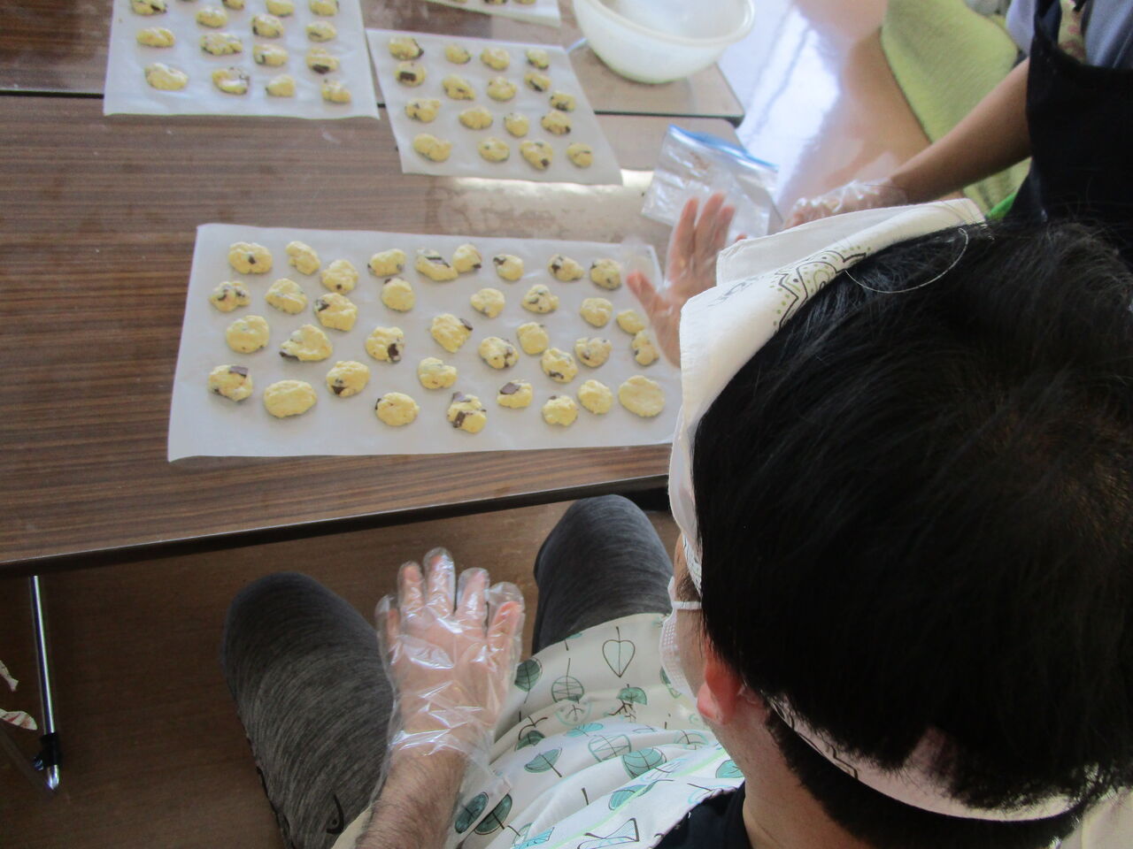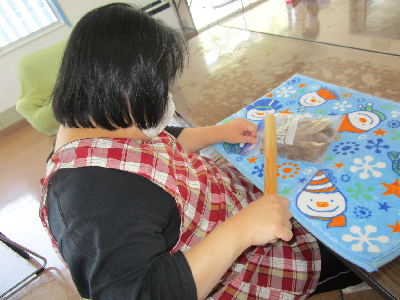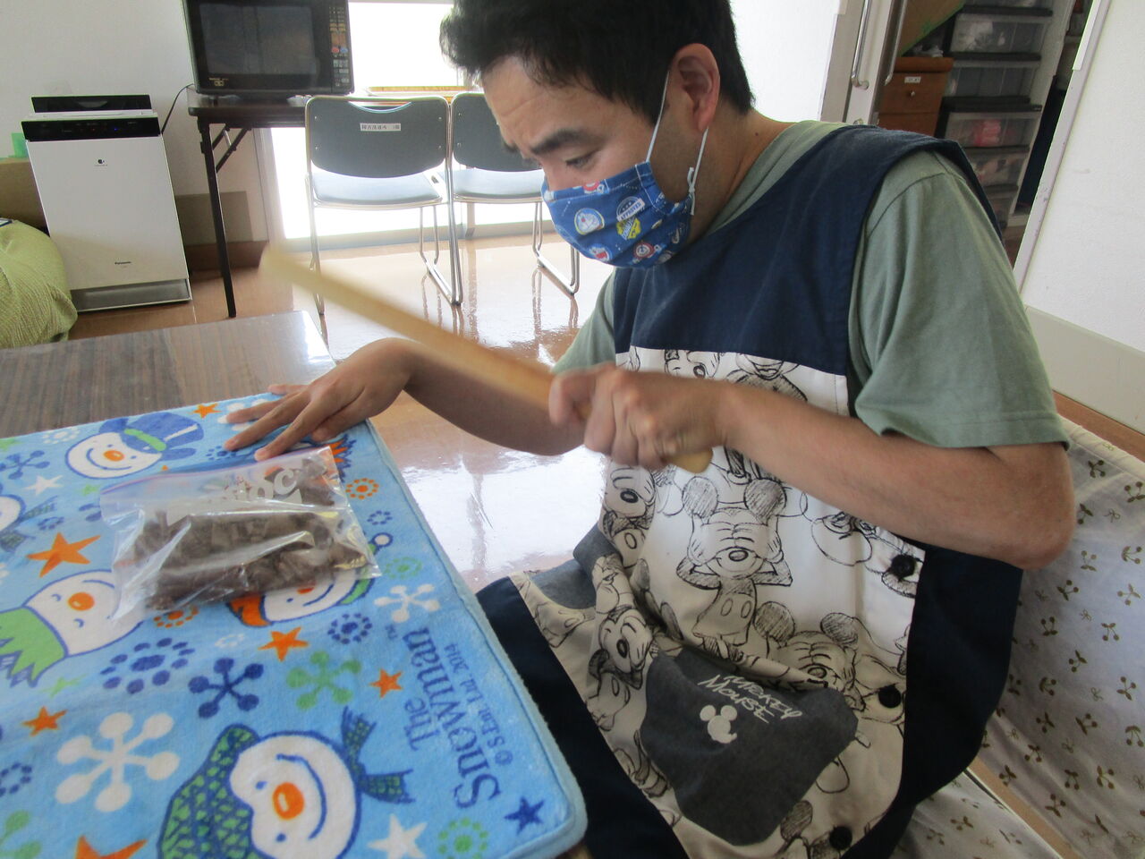 生地は職員が事前んに作っておき、その中に入れるチョコチップのチョコを砕いていきます