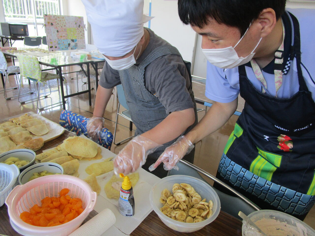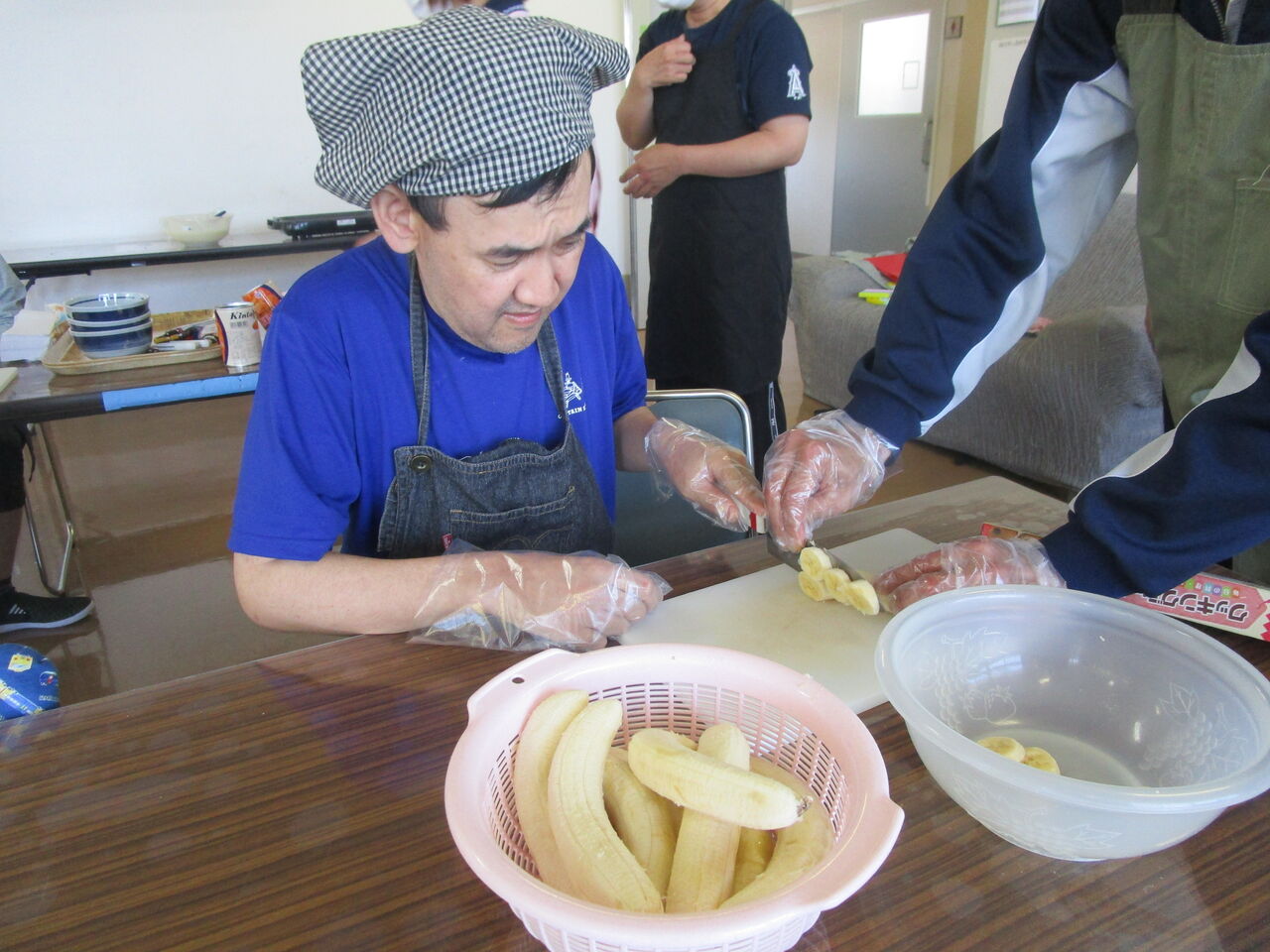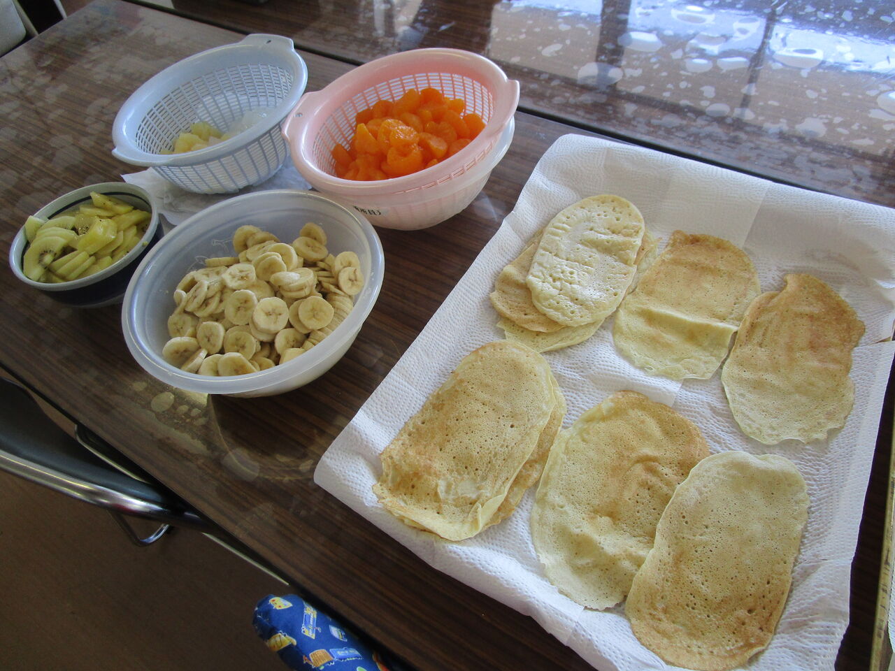 皆さんには、果物のカットや生クリームの準備をして頂きました