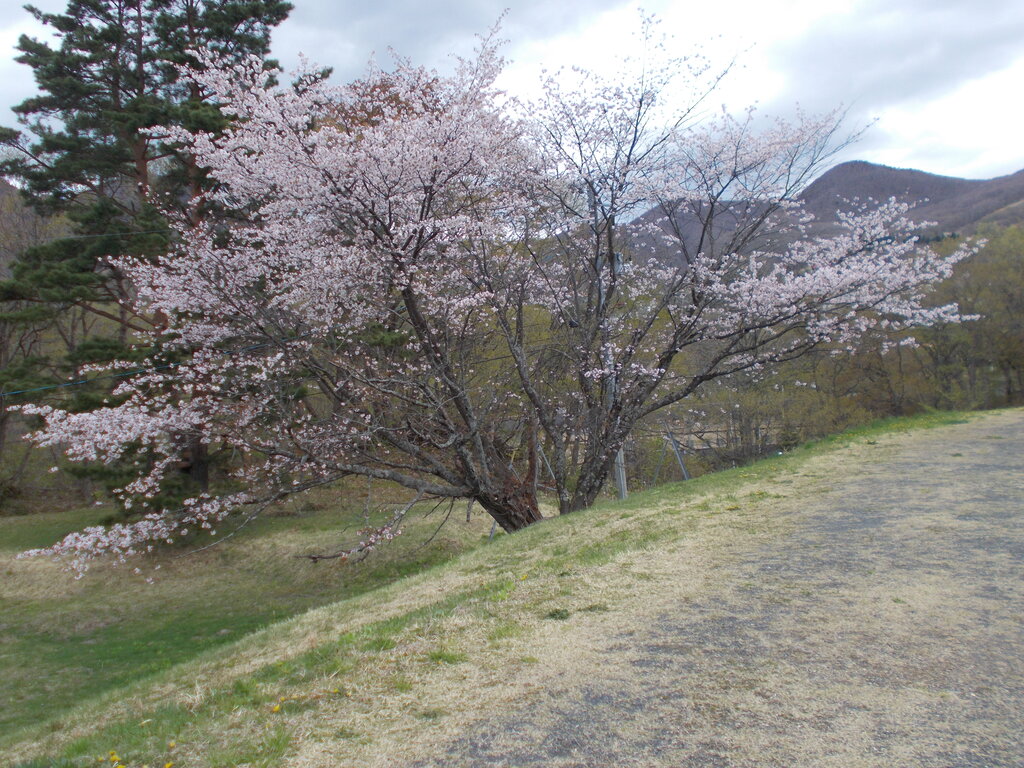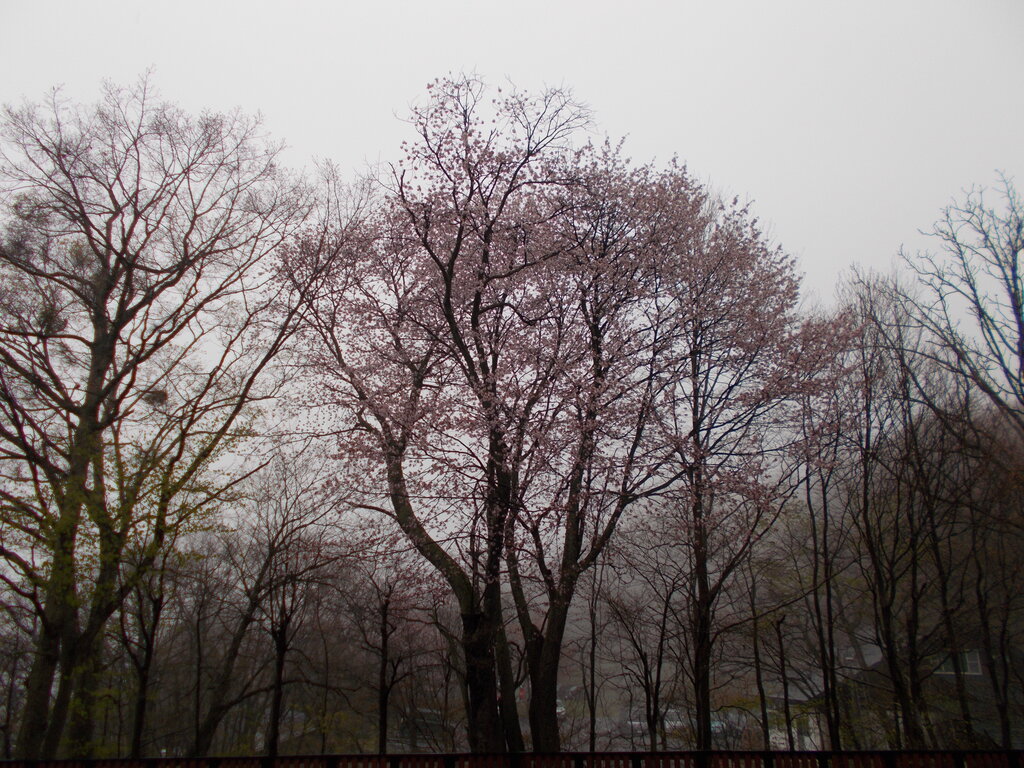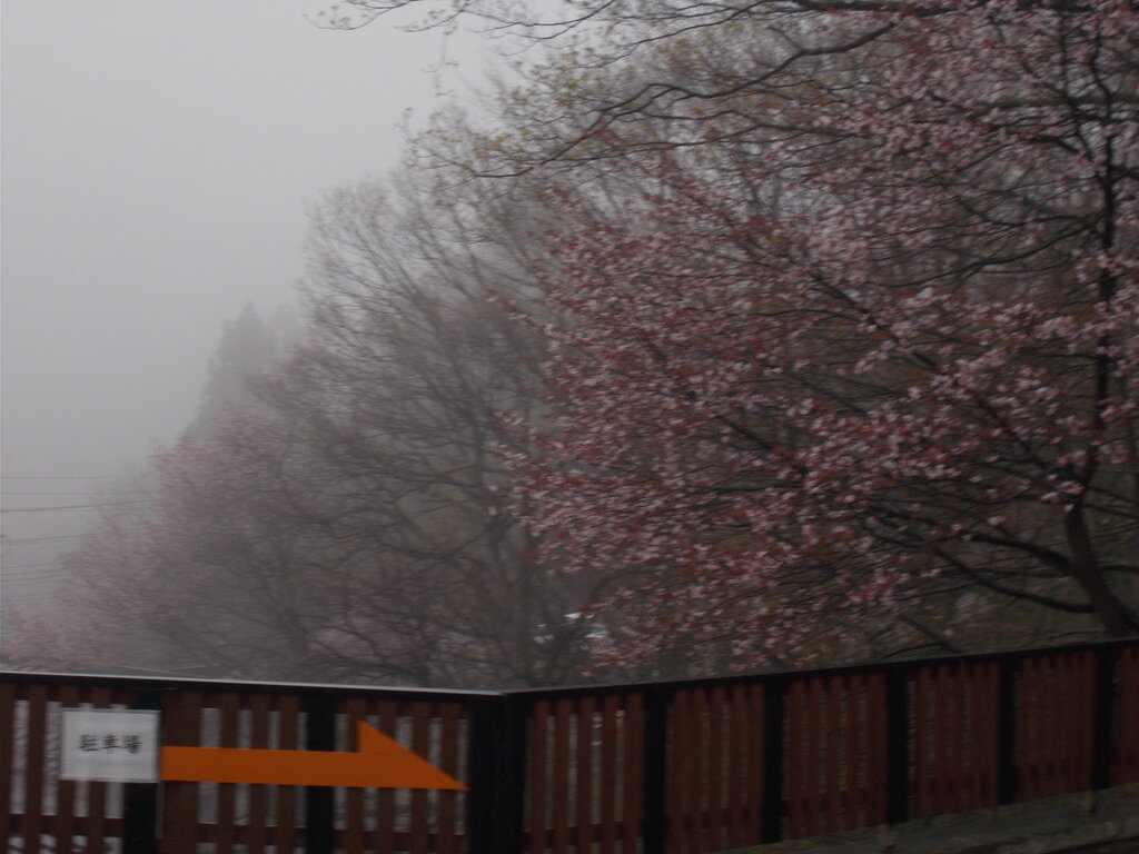 ル・ベール蔵王玄関前・朝7時・14度・小雨・南側の横倉山1,100m以上雲の中・北側の龍山も標高1,100m以上雲の中、蔵王温泉内の桜は散りました!!!北側の龍山オオヤマザクラが所々満開です!!!ル・ベール蔵王南側50mの中森ゲレンデにある二度川源泉棟左にある秡川登山道標識があたらしくなりました!!!