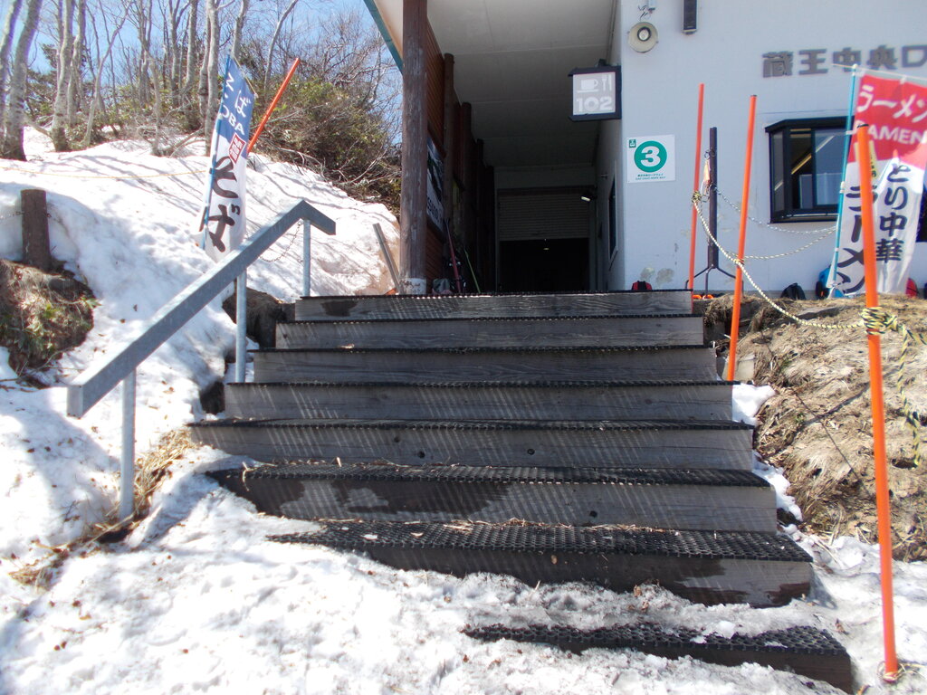 ル・ベール蔵王玄関前・朝7時・6度・晴・温泉駅第一駐車場満車・鳥兜駅階段8段目が雪の上に出ました7段雪の下です。明日は中央第二リフト営業するようです???