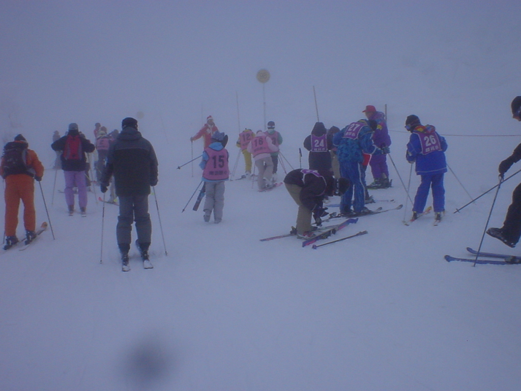 濃霧の中・地元小学生・県外高校生・福岡大学で上ノ台ゲレンデスキー教室で大混雑。