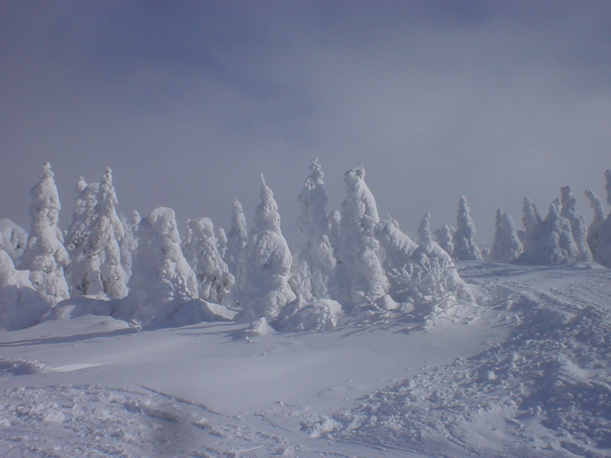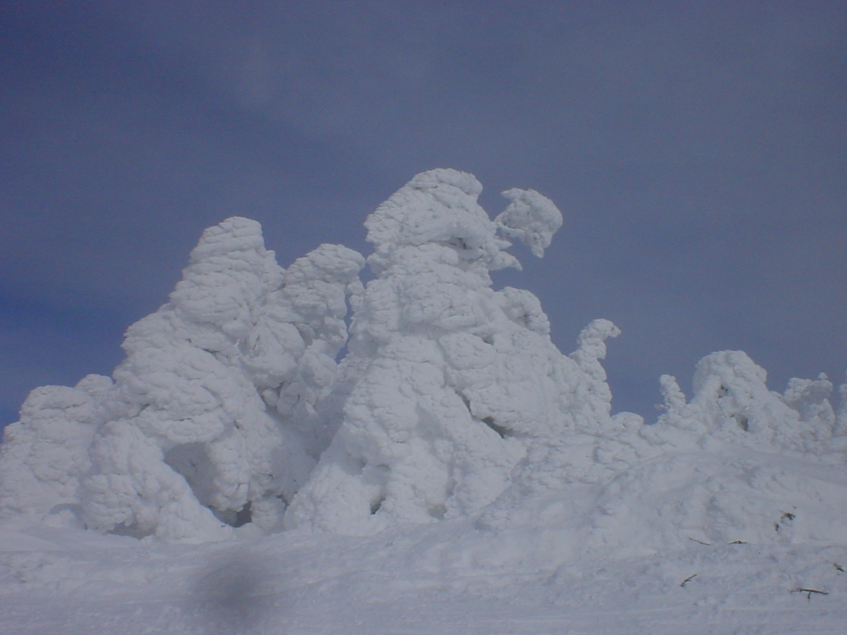 44e3ce5d.jpgル・ベール蔵王玄関前ー5度快晴,午後より1.200m以上濃霧・曇、大森ゲレンデ・黒姫ゲレンデ・百万人ゲレンデ・ユートピアゲレンデ堅いバーンで滑りやすかった。黒姫で地元元スキー教師大正13年生まれの大先輩が快晴なので滑りにお出ででした。黒姫ジャイアントをスイスイとお滑りでした。私共も20年後あんなに上手に滑れるか、あんなに元気でいられるかうらやましいかぎりです。ユートピア外人スキーヤーが滑っていました。フニテル満員で運行していました。1.400m以上樹氷が出来ています。地蔵山頂駅ー12.2度今年1番寒い日でした。手袋をしていても手が凍える感じです。台湾・韓国の観光客が日本の観光客より多く来ていました。写真はザンゲ坂96番付近の樹氷です,海老の尻尾がきれいにできています。ザンゲ坂の圧雪今年1番良い出来凸凹ゼロ平坦と良く出来ていました。