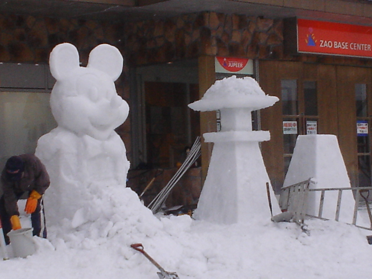 樹氷まつりの為、ジュピアの正面玄関にキャンドルスタンドの壁・灯篭・ミッキーマウスの雪像をスタッフが製作中でした。写真は製作中のミッキーマウスです。風が有り気温以上に寒さが厳しく手が冷たくなりました。ダイヤモンドではー4度でした。