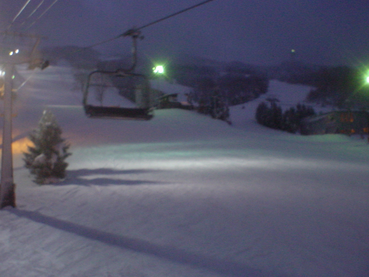 明日10日と11日2日間朝から大会をしていますのでアルペンの醍醐味を目の前でご覧になれます是非お出でになって応援してください。上ノ台・高鳥のナイターで滑ってきました。写真は蔵王温泉第2高速クワットからゲレンデを写したスナップです。少しぶれていますが雰囲気を感じてください。ゴーグルをしていても凸凹がはっきりするほど明るかった。第2クワット乗場の寒暖計ー5度でした。蔵王スキー学校・蔵王ハイムスキースクールのインストラクターが照明の下で訓練をしていました。ボーダーのインストラクターもいました。上ノ台ゲレンデ⇒サンライズ⇒蔵王大露天風呂⇒かもしか大橋⇒中森ゲレンデと闇の中滑ってル・ベール蔵王へ帰って来ましたが中森ゲレンデピステン圧雪最初で端1本だけだったので新雪でゲレンデ30cm以上の段差が出来ていましたが全面圧雪すれば無くなります。