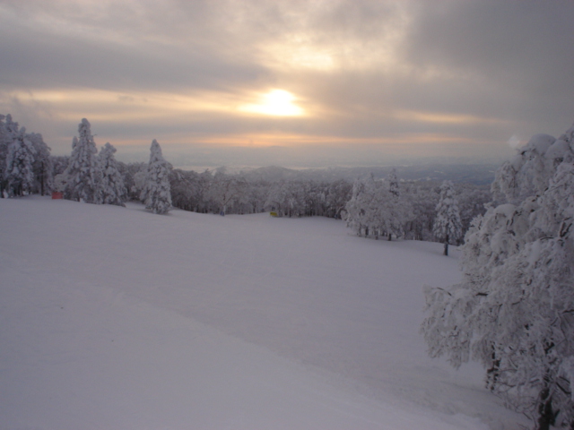 be59806a.jpgル・ベール蔵王玄関前ー4度晴、午後15時40分過ぎより滑った、蔵王中央ロープウエー鳥兜駅ー5度出口の階段3段になりました。雪無の秋には13段でしたからそれなりに積雪は多くなっています。鳥兜ゲレンデで夕方造雪機運転開始し雪造りを始めました。春スキーの為に行っているようです。写真は三五郎リフトから片貝リフトへ行く所から飯豊山方面にしずむ太陽のスナップです。写真で目で見た幻想的な雰囲気が出ていればと掲載しました。見返り・国体コースボーダーが急斜面に挑戦し転倒していた。バーンは平坦度良く高速回転快調でした。高鳥ではハイム・蔵王スキー学校のインストラクターが訓練をしていた。上ノ台ゲレンデー6度無風でナイターなのに暖かった。パトロール数人上ノ台詰所前から帰宅するようなので声をかけたところナイター終了まで2名残して行きますとの事安心しました。5時過ぎより幼児を連れたファミリーが数組ジュピアのエスカレーターで登ってきてナイターを始めた。11月19日ザンゲ坂・樹氷原コースの重たい水分の多い雪の初滑りから70日目、リフト1回券換算ポイント1.402回目を蔵王温泉第2高速クワットに乗り、真暗なサンライズゲレンデを滑り乗場のかもしか大橋側に出現した巨大な雪のねずみの前を通り真暗な中森ゲレンデを滑って帰ってきました。