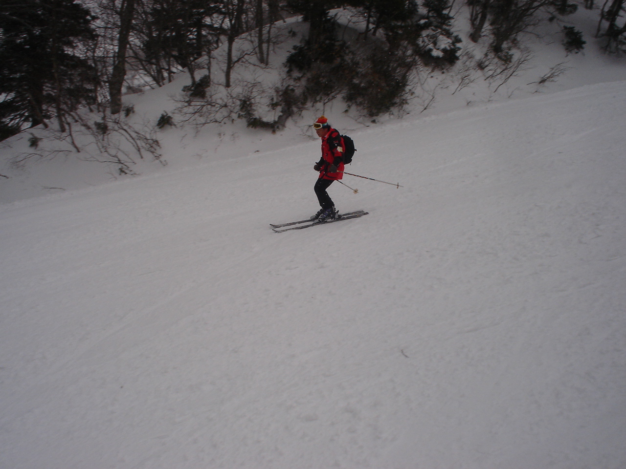 af45427b.jpgル・ベール蔵王玄関前4度晴、蔵王中央ロープウエー駐車場満車100台以上、前の新左衛門の湯駐車場も混雑「建設中の足湯完成」したようです。ゴンドラ強風の為ウェイト吊下げ71名運行、鳥兜駅5度強風、中央ゲレンデ7コース全部ピステン圧雪してくれており全面滑走可能、日大山形高校スキー部、蔵王スキースポーツ少年団、他にアルペン選手滑っていた、スノーボードの三角形の旗ポールを立てスラロームも滑っていた。鳥兜ゲレンデの半分に6本のモーグルコースが出来若者に混じってシニア・ジュニアが滑っていた。モーグルのコーチが数人のモグラーに指導していた。写真はジャンプして空中に浮いているモグラーを鳥兜リフトから写したスナップです、右の雪融け部分はリフト下で滑るのには影響ありません。 岸ハイムスキー校長、蔵王スキー学校・グランドスキースクール・オーストリースキースクールインストラクターが教えていた。パラダイスゲレンデ凸凹が出来ておりくたびれます。今日1番荒れていたバーンでした。上から右側にモーグル用コースが出来上がり3.4フィートの深さの凸凹でアイスバーンですシニアはご注意、迂回コースはピステンで圧雪してくれておりフラットでした。樹氷原圧雪していましたが雪質悪く制動がかかりました。ユートピア第2リフトのゲレンデ雪を運び全面滑れます。ポールを立てスラロームをしていました。フニテル強風で減速運行、地蔵山頂駅温度計故障、屋内事務所前温度計5度、ザンゲ坂ピステン圧雪しておりフラット滑り易かった。菖蒲沼への連絡コース落ち葉、小枝、黒い何か花粉等で制動がかかりました.ピステンで圧雪すれば良くなります。残雪例年より多いようです。