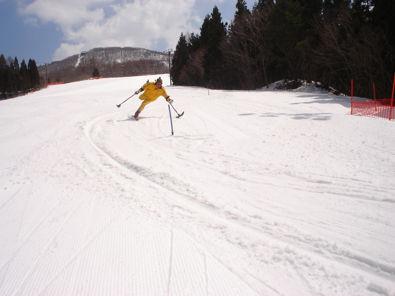 47c21c60.jpgル・ベール蔵王玄関前0度快晴、山形県ハンデキャプスキーヤーと一緒に滑りました。写真はポールを見事に滑っている910さん(尾花沢在住)です。大森ゲレンデ本日でリフトが営業終了しますがまだまだ残雪が多くクローズ残念です。ハンデキャプスキーヤーにとって大森駐車場は段差が無いので皆様良く利用するそうです。公共施設、スーパーの駐車場のようにゲレンデ側にハンデキャップマイカー専用の駐車ゾーンを設置してはと思いました。大森ゲレンデに毎年よくお出でになるスキーヤー、大森レストランにエレベーターあるのを知らなかった便利なので来シーズンは利用しますとおっしゃっていました。黒姫リフト混雑し乗車待ちが必要、百万人ゲレンデ大回転のポールを立て滑っていた。リフトゲートまでスキーヤーが並ぶほど混雑していました。一部アイスバーンがある程堅いフラットなバーンでした。連絡コース経由菖蒲沼リフトへ、スタッフ明日から週末に運転になりますと教えてくれた。片貝リフトスタッフ明日から休んで週末運転しますと教えてくれました。全員で大平コースをノンストップで滑りました、ジュピアにエレベーターがあるのでハンデェキャップの皆さん安心して玄関前の迎えのバンに行けました。午後蔵王中央ロープウエーで鳥兜駅へ行きましたが温度+5度と今年1番の暖かさでしたが夕方寒い風で堅くなり始めました。鳥兜ゲレンデポールを立て滑っていました。日本スキー連盟技術員岸宏校長が30人以上の研修生を指導していた。鳥兜リフト混雑していました。2度目の大平コース少しバーンが固まりスピードに乗れました。サンライズ手前でボードのお嬢さんが怪我をし蔵王スキーパトロールがスノーモービルで助けに来ていました。明日から運行しているリフトは、黒姫第1・百万人、ユートピア第1、中央第1リフト(鳥兜リフト)の4本は5月6日迄、パラダイス第1リフト5月6日迄出来る限り運転するとの事です。週末に運行するのは、見返り,片貝、菖蒲沼,ダイヤモンドです。