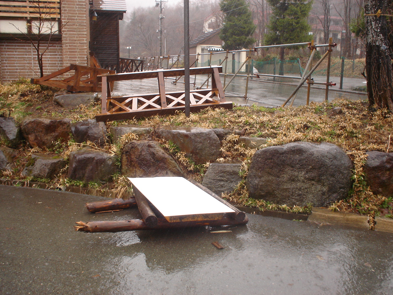 88c9da66.jpgル・ベール蔵王玄関前6度暴風突風がゴーゴーと音を立てています。蔵王温泉スキー場公式ホームページのゲレンデ情報4月18日朝8時43分更新によると蔵王ロープウエー・蔵王スカイケーブル・中央リフト・ユートピアリフト全て運休でした。雨も降っていますが暴風による運休です。今シーズン全て運休は始めてでスキー滑りに行けません。151日目のスキー滑走断念致しました。写真は暴風により第一三共製薬蔵王寮の看板が根元から折れ道路に飛ばされ、建物に玄関前に置いてある木製の構造物(数10キロの重さがあるようです。)が道路に飛ばされそうになっているスナップです。仙台のスパーゼネコン担当者へ電話連絡2時間半後に確認と撤去に山形市内から登ってきました。閉鎖中の管理を委託されているのに危険物に対する対応が全くなされていません。3月には屋根からの雪と氷が道路へ落ち大事故がおこるところでした。お山は驚くほど強い風や大量の雨や雪が降ります。今後の対応をオーナーにお願いしたい。事故が無く幸でした。明日は蔵王中央ロープウエーが営業しますので滑りにまいります。
