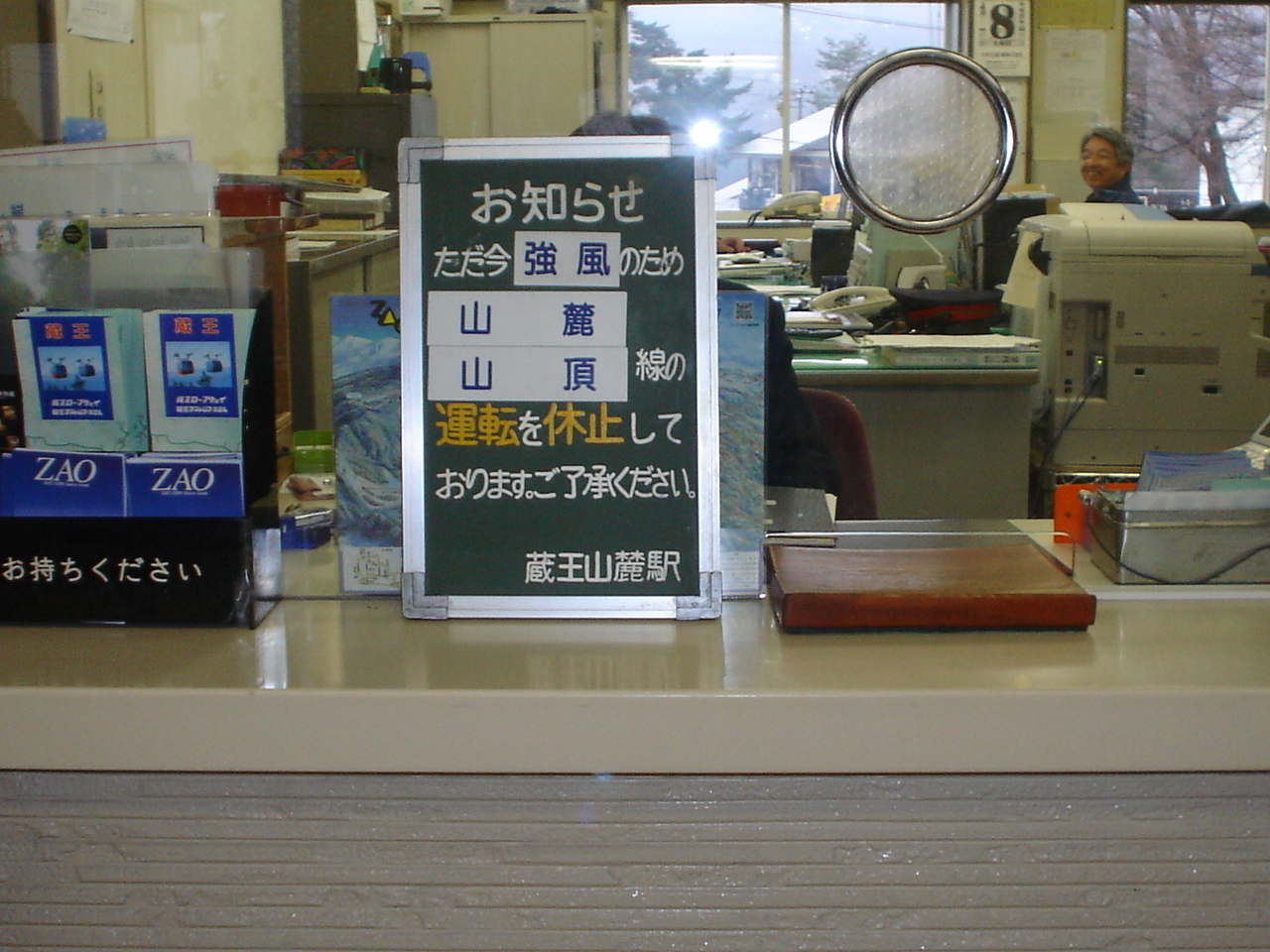 bdcd3608.jpgル・ベール蔵王玄関前2度暴風時々小雨、蔵王中央ロープウエー温泉駅に行ったら今で運休山頂30m以上の強風との事、蔵王ロープウエー山麓駅に行き乗車待ちしていたら、電話がスタッフに入り蔵王河童を乗せた後運休との事、降りて来たゴンドラにスキーヤーお2人乗っていたのでご一緒に滑りませんかとお話した所暴風でひどくて乗ってきたとの事、樹氷高原駅1.9度濃霧・暴風、新雪が薄っすら積っていた。雪が顔に当たって痛かった。百万人ゲレンデ迄歩き滑ったが圧雪をしてくれており昨日の凸凹無くなりフラットで濃霧と暴風の中ザラメのスピードが出るバーンを快調に滑れました。百万人から横倉ゲレンデまでも昨日と違い制動がかからず滑れました。横倉ゲレンデもフラットで無事悪天候の濃霧の中山麓駅迄滑り降りてきました。写真は山麓駅窓口に掲示された運休の表示です。常連のスキーヤーの方何方も滑りに来ていないようでした。