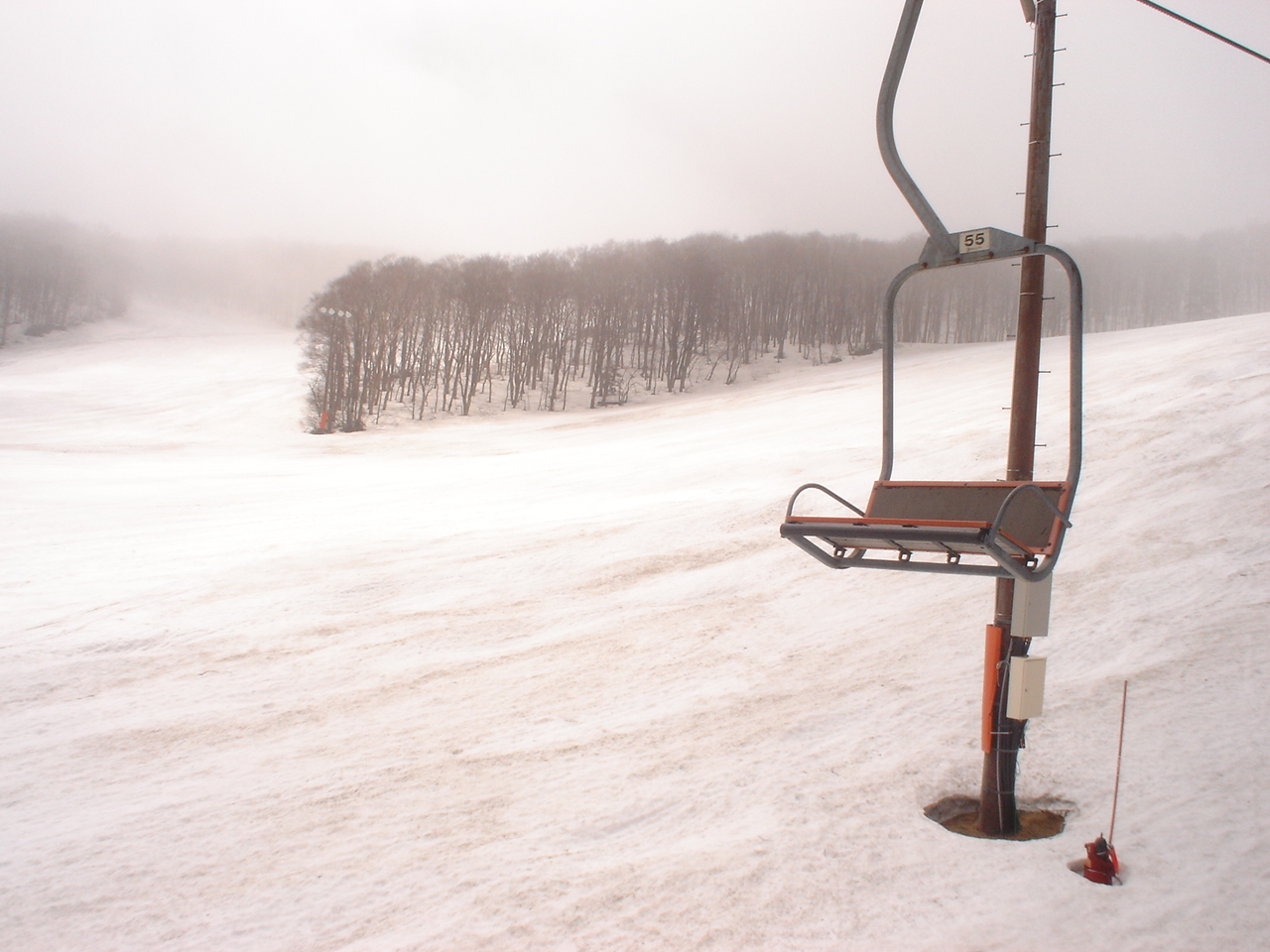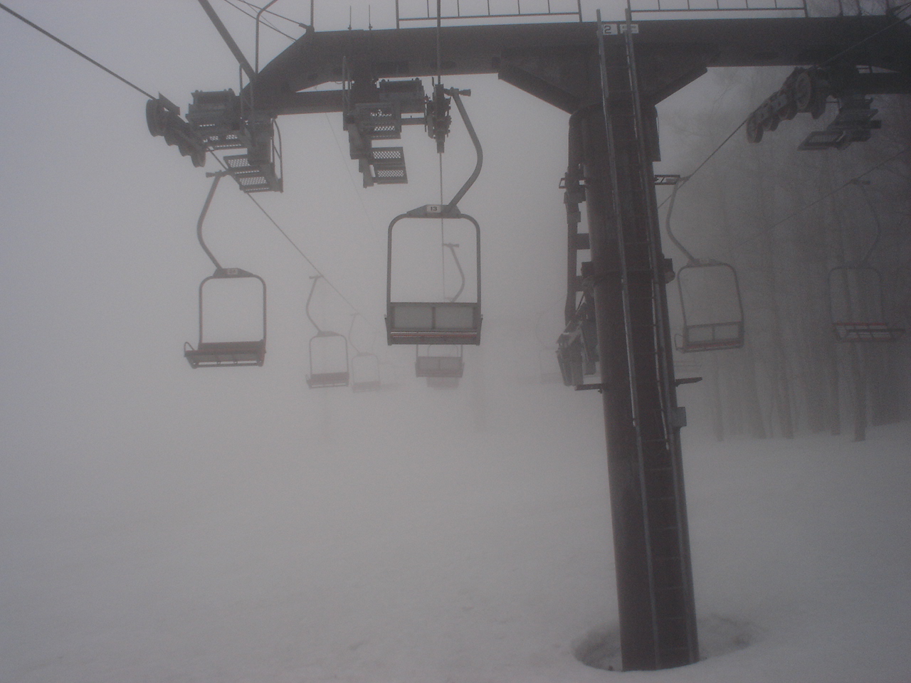 初心者の若者ボーダーグループ、モーグラーグループ・シニアスキーヤー他濃霧の中滑っていた。写真は鳥兜リフトで写した、視界2・30mでした。ゲレンデのバーンはシャーベットでスピードが出る雪質ですが一部重たい所もありました。小雨が降っているのでリフトスタッフがチェアの水きりをしてくれました。今シーズン始めて合羽を着て滑りました。(11月19日以来143日目で始めての合羽着用でした。)大平コース全面滑走可能、途中で中級のボーダーを追い越して滑って降りた。サンライズ迂回コースも滑れ蔵王温泉大露天風呂駐車場迄ノンストップで滑りました。風が弱いので寒さは感じなかった。中森ゲレンデ真中土が出て両脇10m位、後1週間ぐらい滑れるようです。小雨だったのでウェアほとんど濡れませんでした。3日間悪天候でしたので明日は晴れてくれると思います。