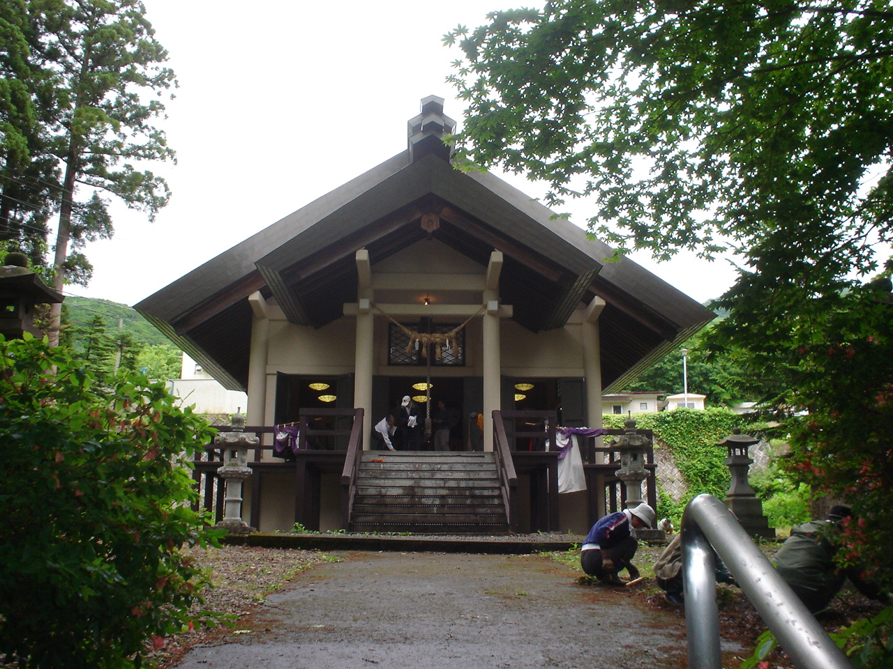 15cdb1cd.jpgル・ベール蔵王玄関前15度曇、標高1.000m以上濃霧、1月遅れの蔵王地蔵尊春季例大祭雲の中で行われました。同時に100年以上前に壊された小地蔵の頭の修復完成披露と修祓式も行われました。蔵王温泉街住民全員総出で26日行われる酢川温泉神社例大祭の準備作業が行われました。写真は神社の準風景です。草刈・本殿清掃・のぼり立て・階段の清掃も行われました。酢川神社手前の薬師神社で25日行われる蔵王高湯系こけし工人会奉納祭の準備も行われました。上ノ台南通りが酢川と交わる橋のガードレールを昨年夏大型バスが通ろうとして倒した復旧工事が始まりました。