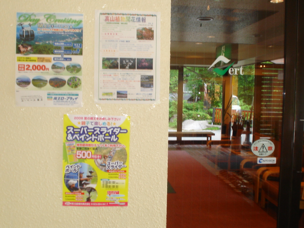 93e285f4.jpgル・ベール蔵王玄関前10度曇、蔵王ロープウエー山麓駅より「高山植物開花情報」6月13日発行第2号が昨日届きました。山頂付近でミネザクラ他6種、樹氷高原駅付近でマイズルソウが咲きはじめました。詳細はA4の情報をA3に拡大し当館玄関自動ドア手前に掲示しております。写真は、高山植物開花情報、蔵王ロープウエー山頂往復特別料金ポスター・親子で楽しめる上ノ台ゲレンデのスパースライダー、ペイントボール割引ポスターを掲示している写真ですガラスに外の風景画写っていました。スーパースライダー、ペイントボール特別優待割引チケットはフロントにございます。1回100円引きになります。