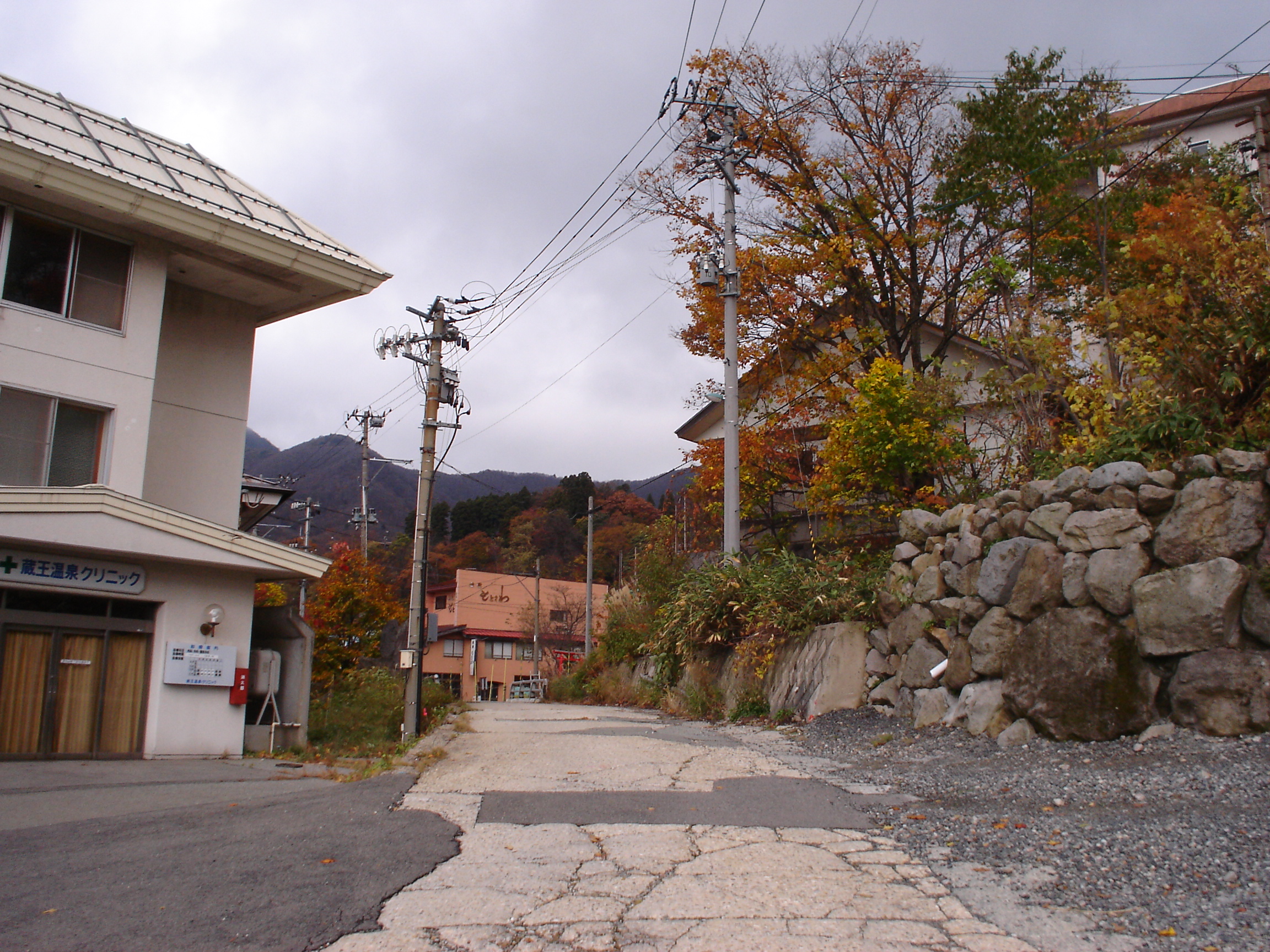 10f56b38.JPGル・ベール蔵王玄関前7度曇、鳥兜山に帽子ががぶったような雲があり見えません。蔵王中央ロープウエー鳥兜駅2度風速6mウエイト吊下げ定員減で運行しています。中森ゲレンデの紅葉は後数日持ちそうですが連休には落葉していると思われますが蔵王公園線赤い大鳥居から上が連休に紅葉が始まると思われます。写真は左建物現在閉鎖中の蔵王温泉クリニックです、スキーシーズンにはスキー・ボードで怪我をした方で混雑します。右側電柱右の建物が旧第一生命温泉棟です。この道路が拡張されます。4年以内のようです。正面のもとさわ旅館は閉鎖中で蔵王温泉某ホテルグループが購入したとの噂があります。旧第一生命手前右に温泉湯管が埋設されている作場道があります。スキーシーズンも温泉で雪が融けて通れます。
