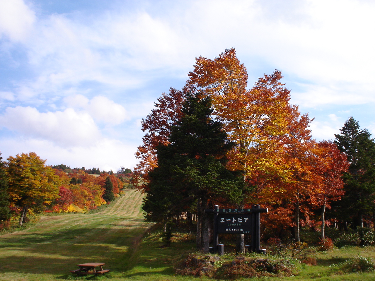 36d7f492.JPGル・ベール蔵王玄関前13度曇強風高い木々がゆらゆら風にあおられています。蔵王中央ロープウエーウェイト吊下げ運行、高湯通り日帰りのお客様多く下湯共同浴場他混雑しています。定期バスでトレッキングに登山姿のトレッカーがゾロゾロおいでです。写真は蔵王ロープウエー樹氷高原駅上ユートピアゲレンデの紅葉と草刈終了したゲレンデを写しました。ユートピア看板に標高1.340mと記載されています。