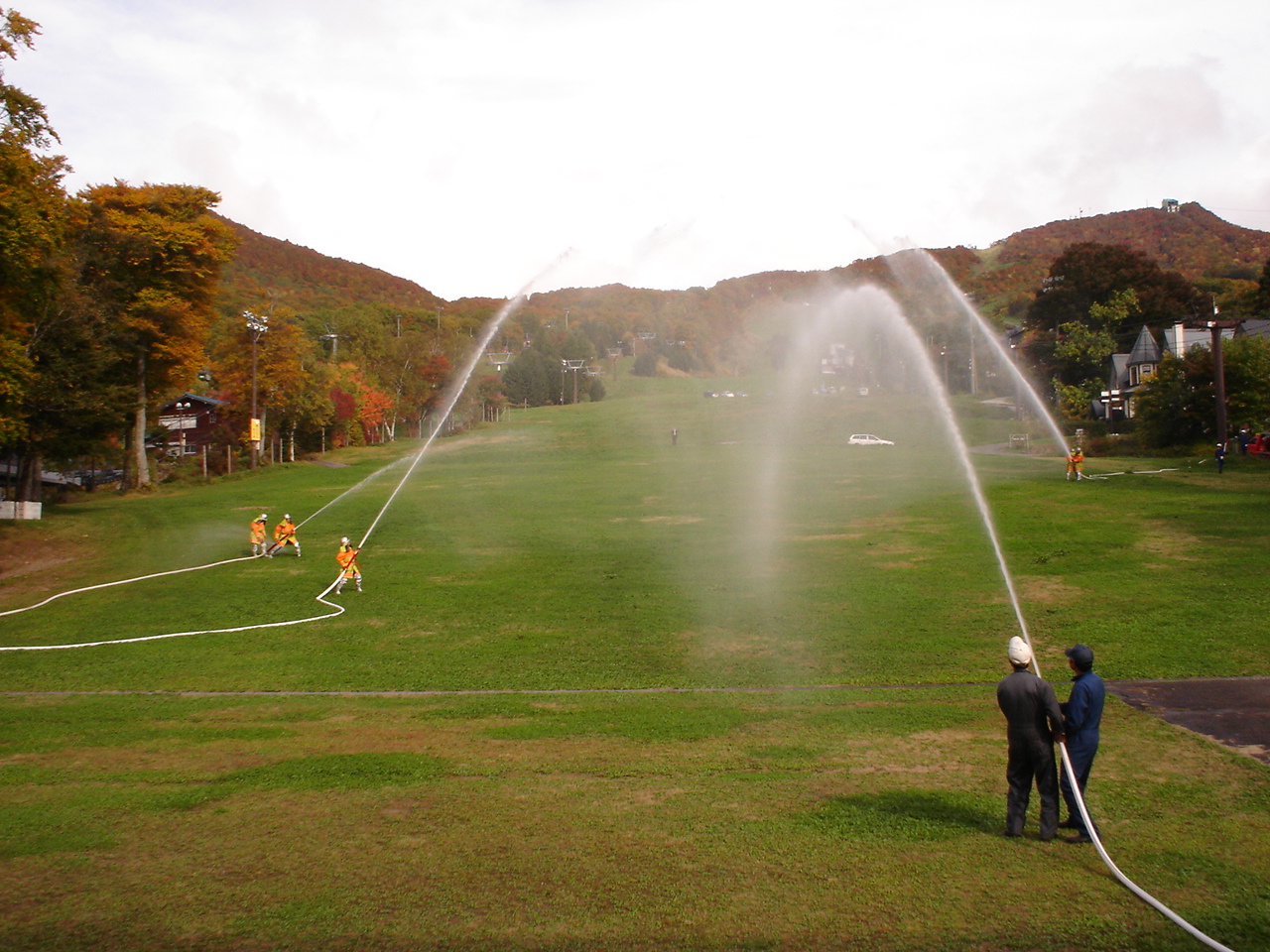 384ba762.JPG紅葉の鳥兜山の下上ノ台ゲレンデで14時より放水訓練をしました。2台の蔵王温泉山形市第五部消防隊の消防自動車から三本の放水と冬のスキーセンタージュピアからスタッフがジュピア屋内消火栓ホースを伸ばし参加しました。この後蔵王温泉体育館で初期消火訓練・応急搬送訓練・一般住宅用火災報知器設置義務化の説明等講義を消防本部から説明を受けました。
