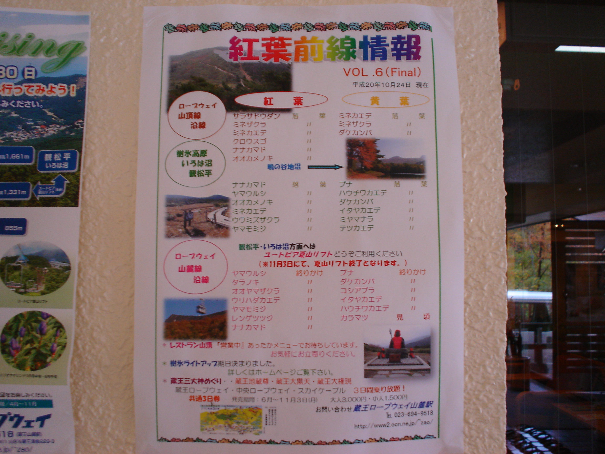 76491769.JPGル・ベール蔵王玄関前14度、朝雨、昼から曇、蔵王ロープウエー山麓駅発行紅葉前線情報VOL.6Final号が届きました。山麓線のカラマツだけが見頃になっています。写真は今朝届いたFinal号です。新緑から毎週蔵王ロープウエー山麓駅スタッフの皆様有難うございました。紅葉は蔵王温泉から標高700mの童子平へ降りていきました。ユートピア夏山リフト11月3日で終了、蔵王三大神めぐり三日間乗り放題の乗車券も6月から販売されましたが11月3日で販売終了です。昨夜の強風で高い木が丸坊主になりました。