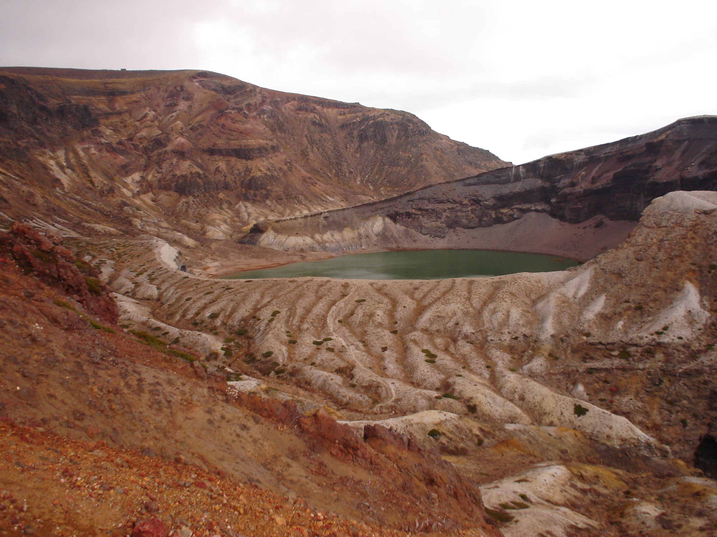 837a9c8e.JPGル・ベール蔵王玄関前11度曇、蔵王温泉PTA歩こう会でトレッキングに行きました。朝8時45分蔵王ロープウエーー山麓駅集合、総勢18名、岸宏保体部長の挨拶で地元庄司・志田山岳インストラクター他16名で地蔵山頂駅⇒蔵王地蔵尊前でストレッチ⇒ワサ小屋跡⇒熊野十字路⇒馬の背〔お釜写真撮影〕⇒刈田岳下柵よりお釜方面へ入る⇒写真のお釜は右五色岳正面山形側避難小屋方面です。標高差300m以上あります。⇒標高1.570m五色湖畔⇒標高1.520m水辺⇒五色岳⇒安斉先生小屋跡⇒ロバの耳登山道コマクサの写真写しました⇒熊野岳避難小屋⇒馬の背⇒お釜リフト側登山道⇒刈田駐車場14時無事到着、若い父兄にご一緒に遅くて皆さんに迷惑をかけました。裏から見るお釜の景色一見の価値があります。一周した沢山のお釜の写真が撮れました。