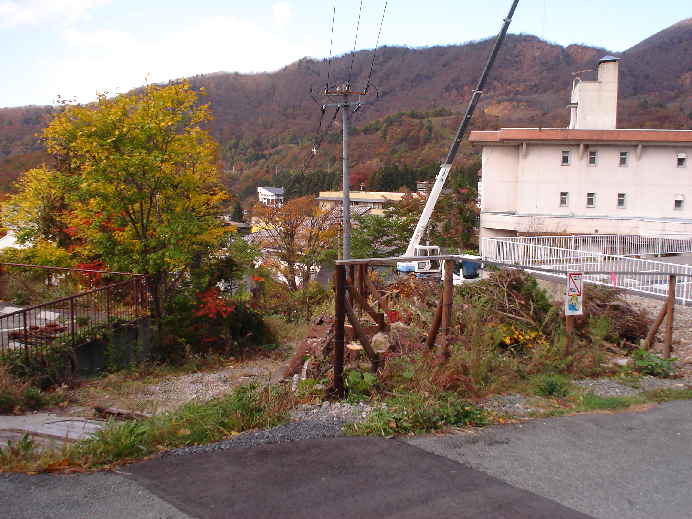 9370c996.JPGル・ベール蔵王玄関前10度曇、風で紅葉の落ち葉が多量に舞い落ちて来掃除しても掃除しても直ぐ積もります。ユアテック蔵王寮跡地植栽のうち特に巨木が空洞が出来倒木で迷惑をかけるといけないと大型クレーン車で木々を伐採していました。写真は紅葉のナナカマドが伐採され他の木々も伐採された空間になった敷地です。右側の建物は旧第一生命蔵王寮でしたが外資が所有していましたが一昨日新所有した不動産会社から数人が点検に来ていました。山形市役所へ訪問しチェックして来たが市担当者より温泉棟が蔵王クリニック前の道路拡張で引っかかる為4年間使えないと言われたと前のロッジオーナーに話していたとの事でした。10日前頃旧東北電力から蔵王センタープラザ迄の狭い道路、山形市から委託を受けた測量会社担当者が拡張工事の道路幅計測に来ていました。ユアテックさんの木々が無くなったので今年の冬吹さらしになり中森道路積雪が多くなり風の強い日には吹溜りも出来ると思われます。