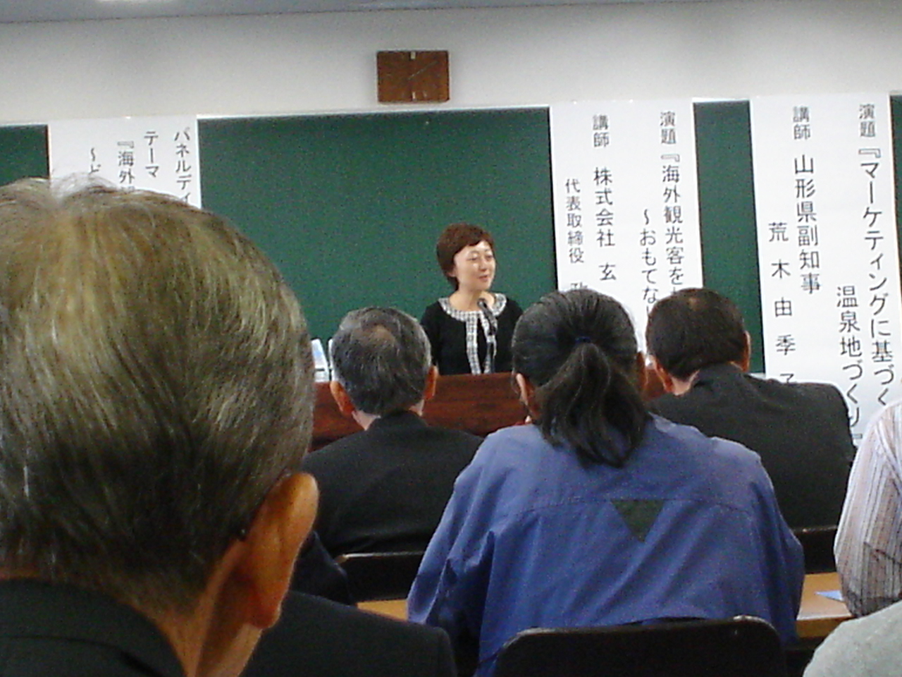 cb489e5e.JPGル・ベール蔵王玄関前12度濃霧、蔵王温泉まちづくりシンポジウム14時より蔵王体育館会議室で講師に山形県新副知事荒木由李子氏・(株)玄代表取締役政所利子氏で行われた。会議室地元メディア数社を含め全席開始10分前に満席になりそれ以後の来場者補助椅子に着席、シンポジウム数回出席しましたがこんなに集まったのは始めて荒木副知事から日本人は旅行しなくなって来た・日帰りが増加・若者が近場か、パソコン、ゲーム等に費用使うようになったので少ないお客様を各観光地で奪い合いになっている。蔵王温泉は別だが山形県への観光客夏にだんとつ多くなっている通年多くするようすべきだ。外人観光客日本全国7.2%・山形県0.9%と少ない等国の観光経済課長時代の数字を資料に建設的な助言をいただいた。ご主人が米沢出身と枕で話された政所氏の老舗観光地ほど落込みがひどい、全国がっかり三大観光地等現状の色々なお話からお客様の現在のニーズに対応し自分達の地元の食・強み等を全面に出して資料と映像により蔵王温泉の行く道をお話された。写真は荒木副知事さんがお話をしている所です。パネルディスカッション前の休息時間に女将会提供の「紅葉鍋」数十人前サービスする準備をしましたが参加者が多すぎて器も鍋もあっという間に足りなくなりました。政所氏は今後も蔵王温泉にサジェッションしたいと心強いお話が締めにありました。45分しか時間が無くもっと聞きたい講師で次もお出ででしたら参加し出来たら一緒に酒を飲みながらお話したい方です。