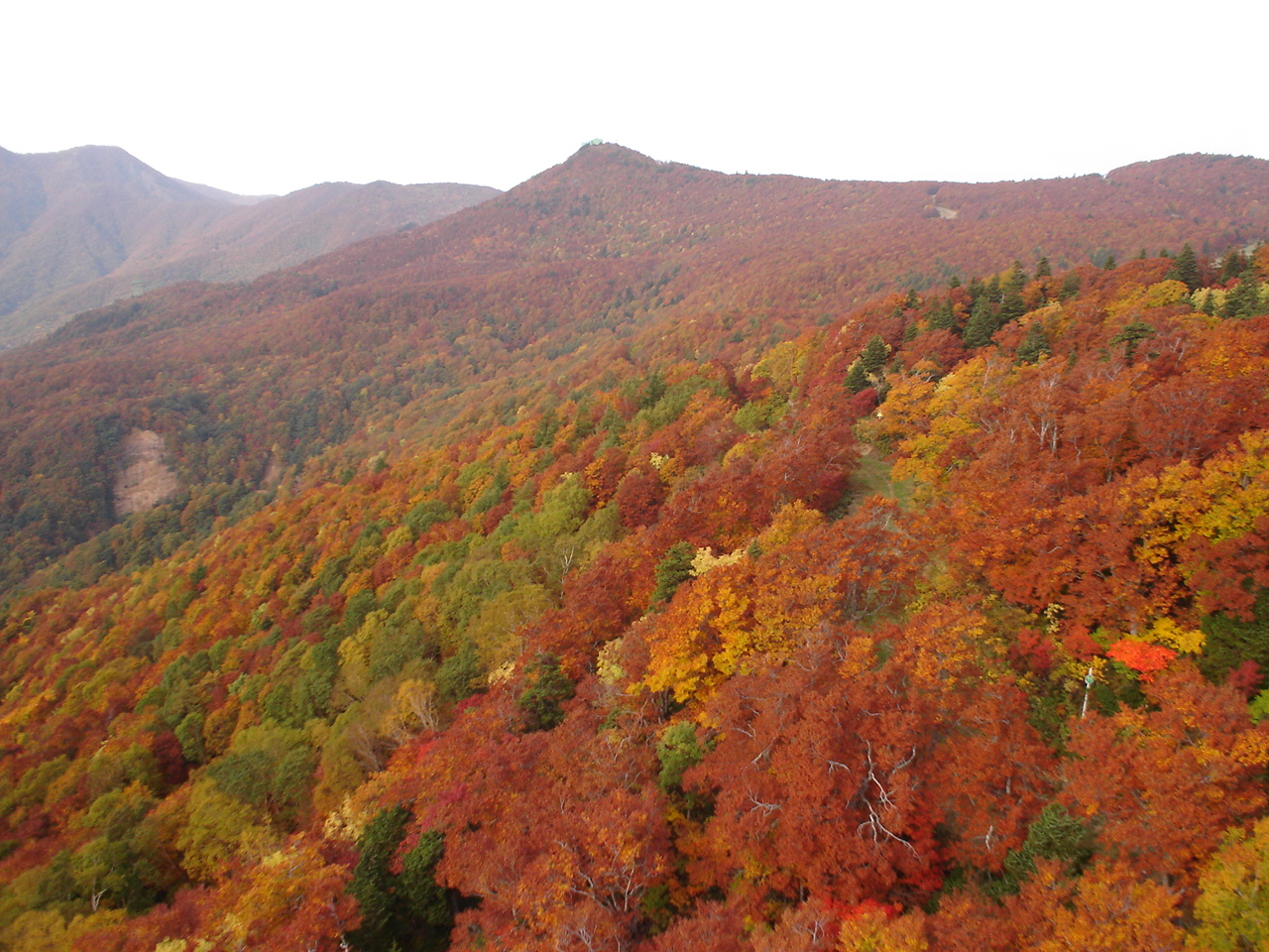 98955dad.JPGル・ベール蔵王玄関前秋晴13度、蔵王ロープウエー山麓駅より紅葉前線情報VOL.4 10月10日現在が早朝届けられた。ロープウエー山頂線沿線紅葉・黄葉とも見頃、樹氷高原・いろは沼・観松平も紅葉・黄葉とも見頃、ロープウエー山麓線沿線紅葉・黄葉とも色づき始めですがカラマツはまだ青葉と記載されています。掲載されている写真は上から地蔵山頂駅前の鐘、三宝荒神山から見た地蔵山頂駅、紅葉の中のフニテル、ユートピア夏山リフト乗り場付近の黄葉、蔵王地蔵尊の後から看板と紅葉の5枚です。横倉山はまだ青葉がおおっています。写真は蔵王スカイケーブルゴンドラから竜山手前大釈山〔1.295m〕の紅葉です。蔵王温泉の北側ですので蔵王ロープウエー地区より紅葉が早いようです。明日からの連休は1.100m以上の紅葉狩り最適です。蔵王温泉街は来週末が紅葉狩りに最適と思われます。